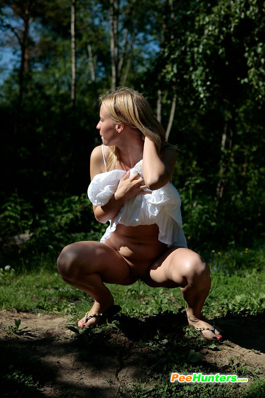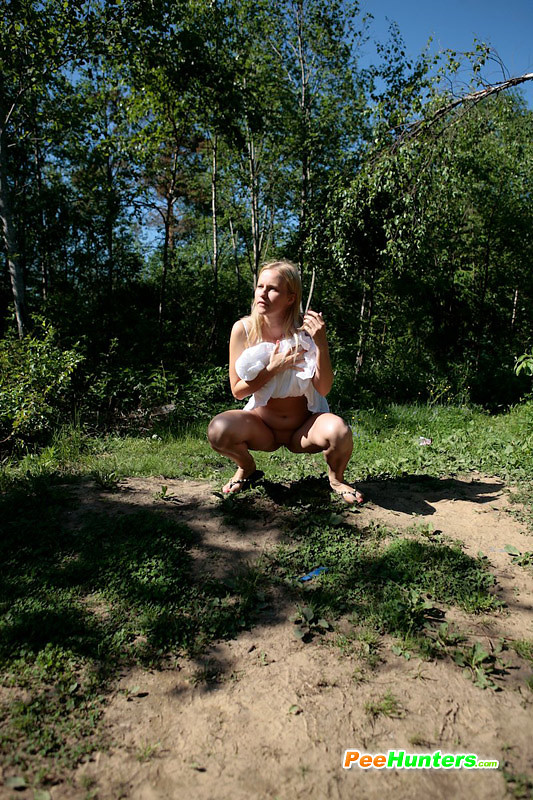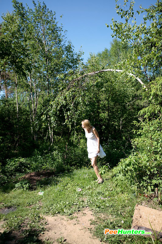 Teenage blondie empties her bladder in the woods