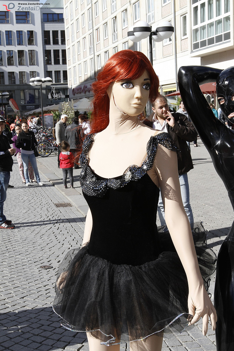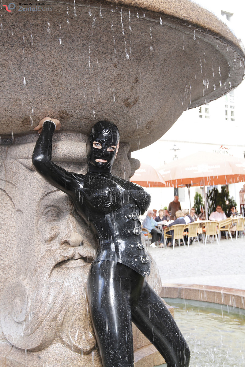 This hot babe looks like a crazy red human reptile in her shiny red spandex suit and with her cat-like green eyes.