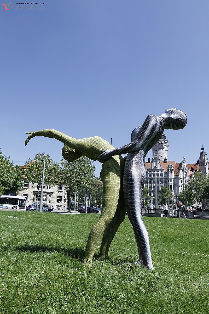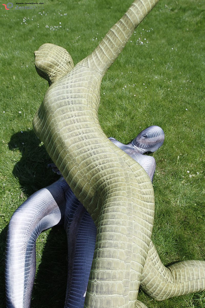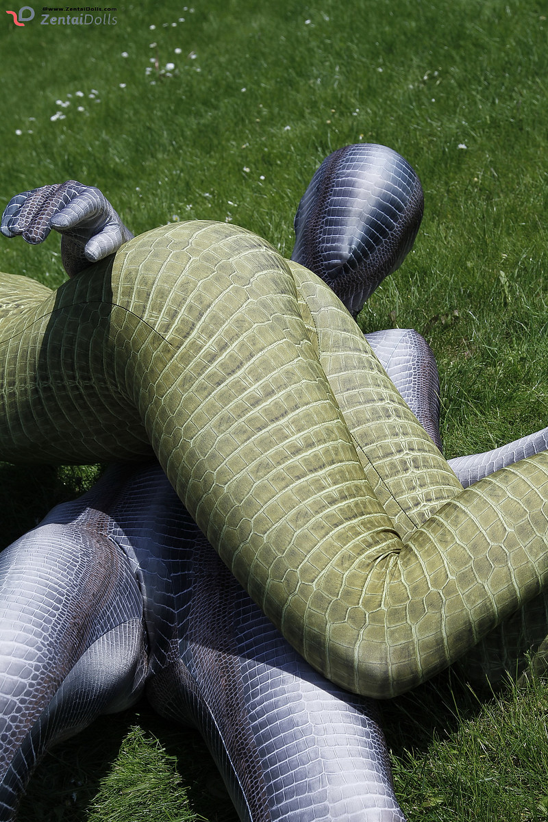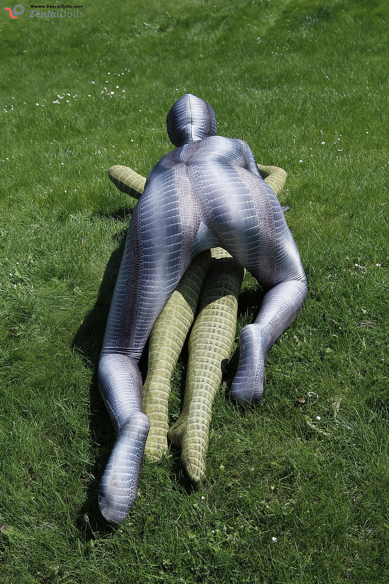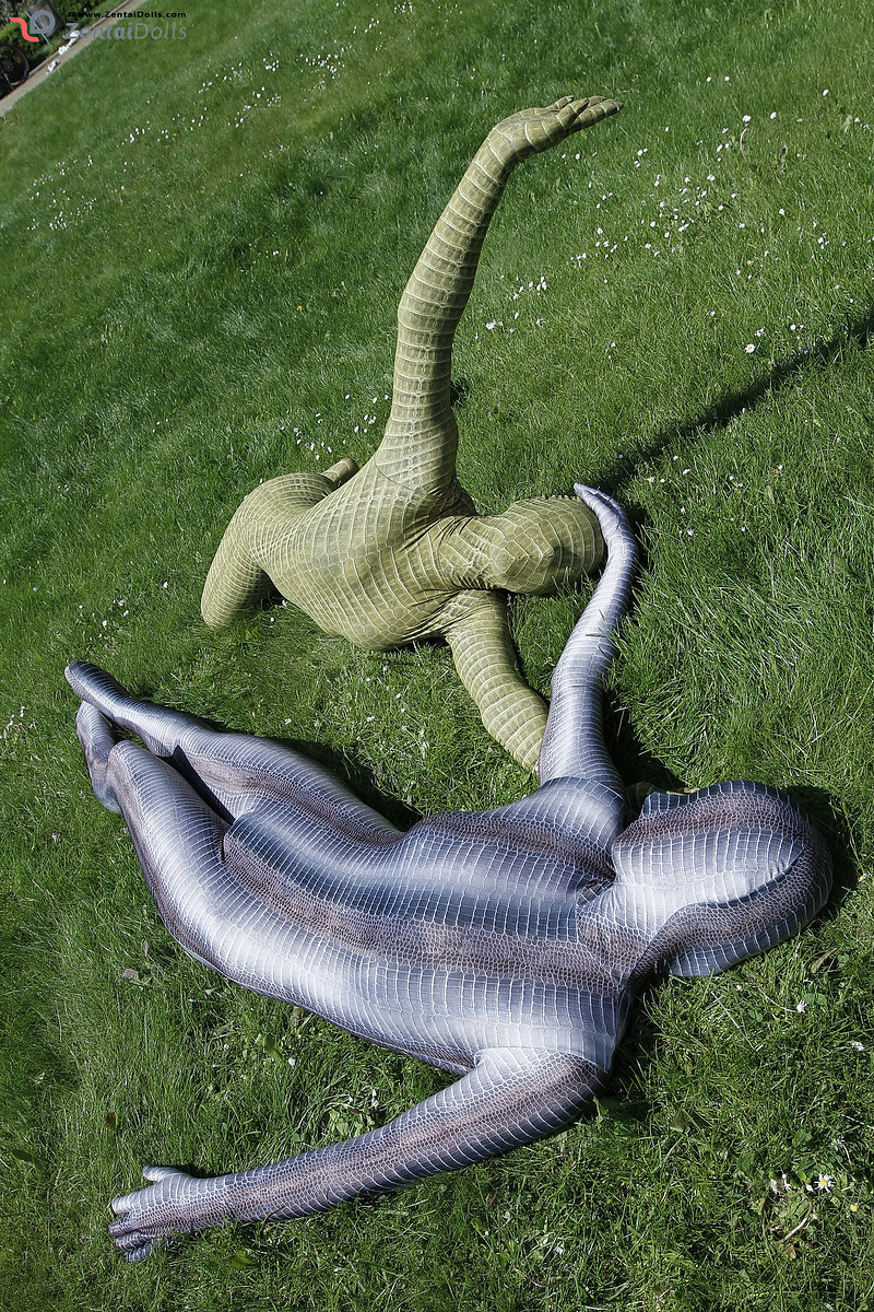 Lesbian in sexy body stockings plays with Real Rubber Doll
