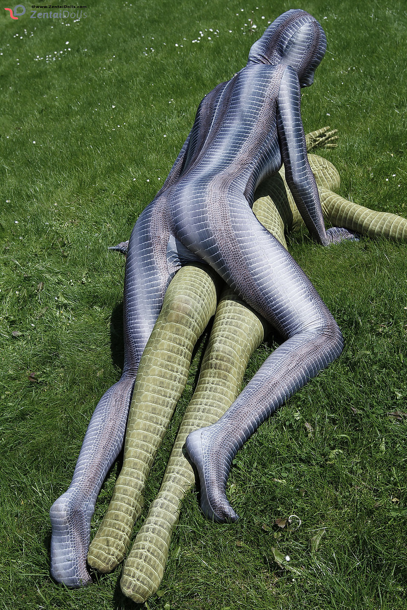 Slutty Zoe puts in nylon mask and suit and spreads asshole