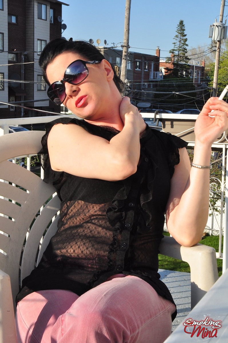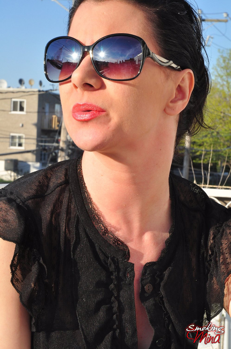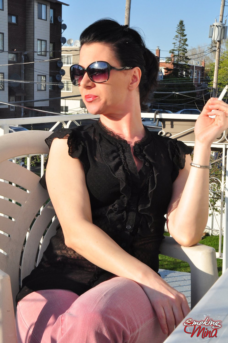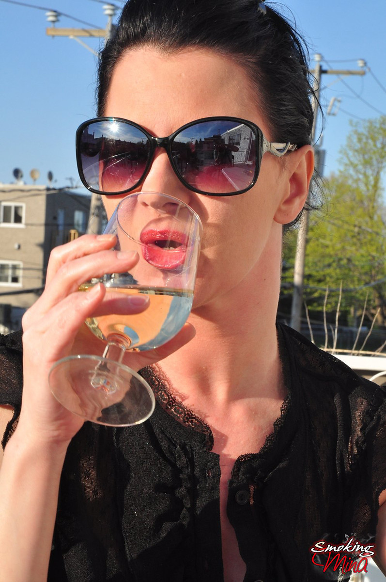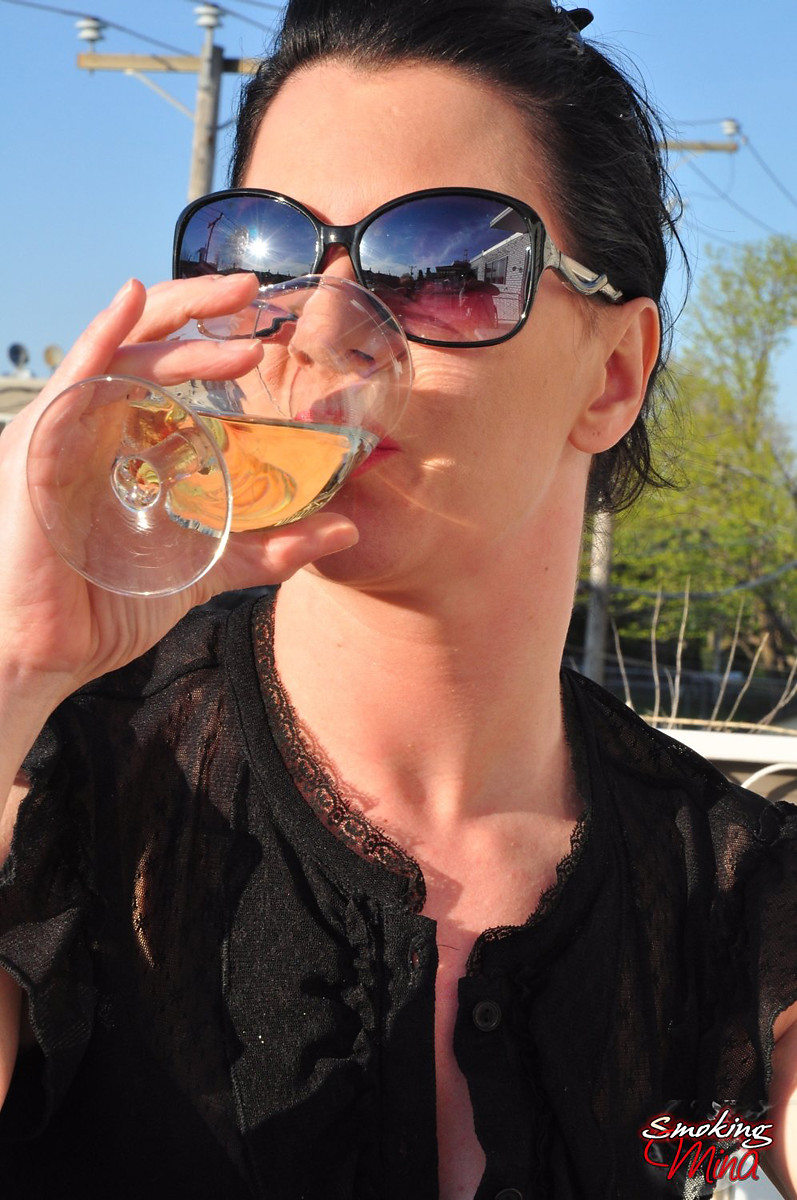 Redhead Mina in shades smoking frenzy drinking wine