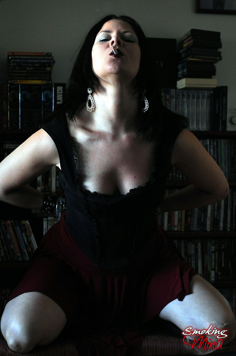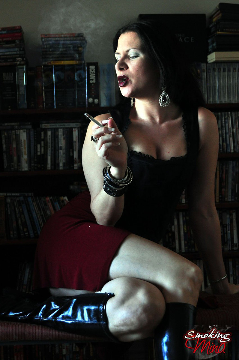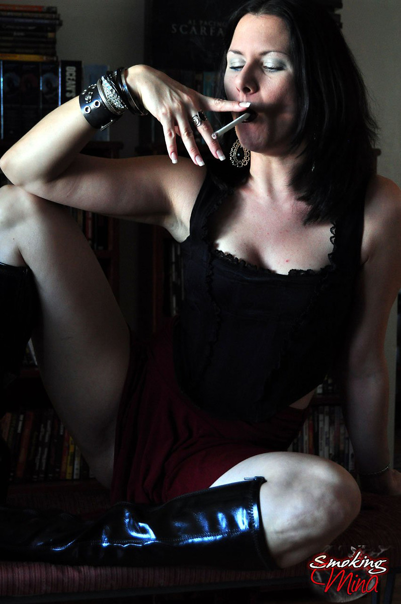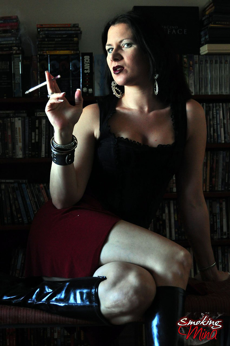 Mina in leather goth outfit sexy smoking