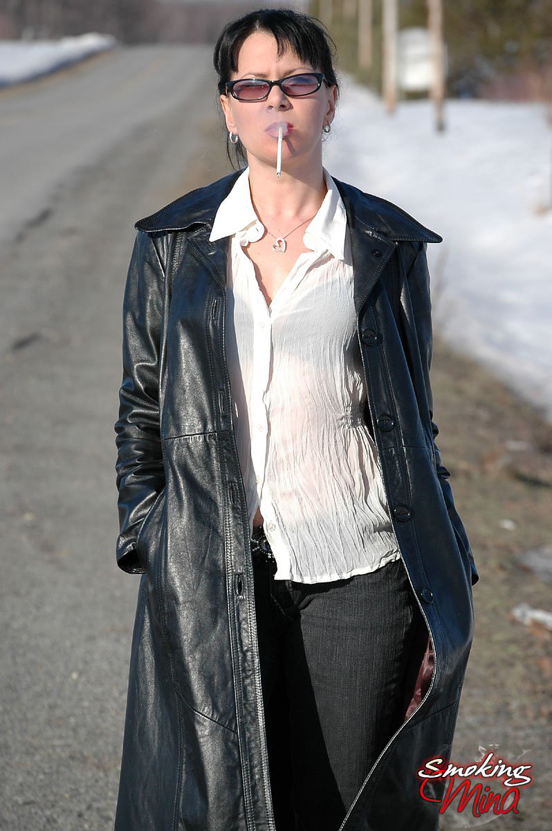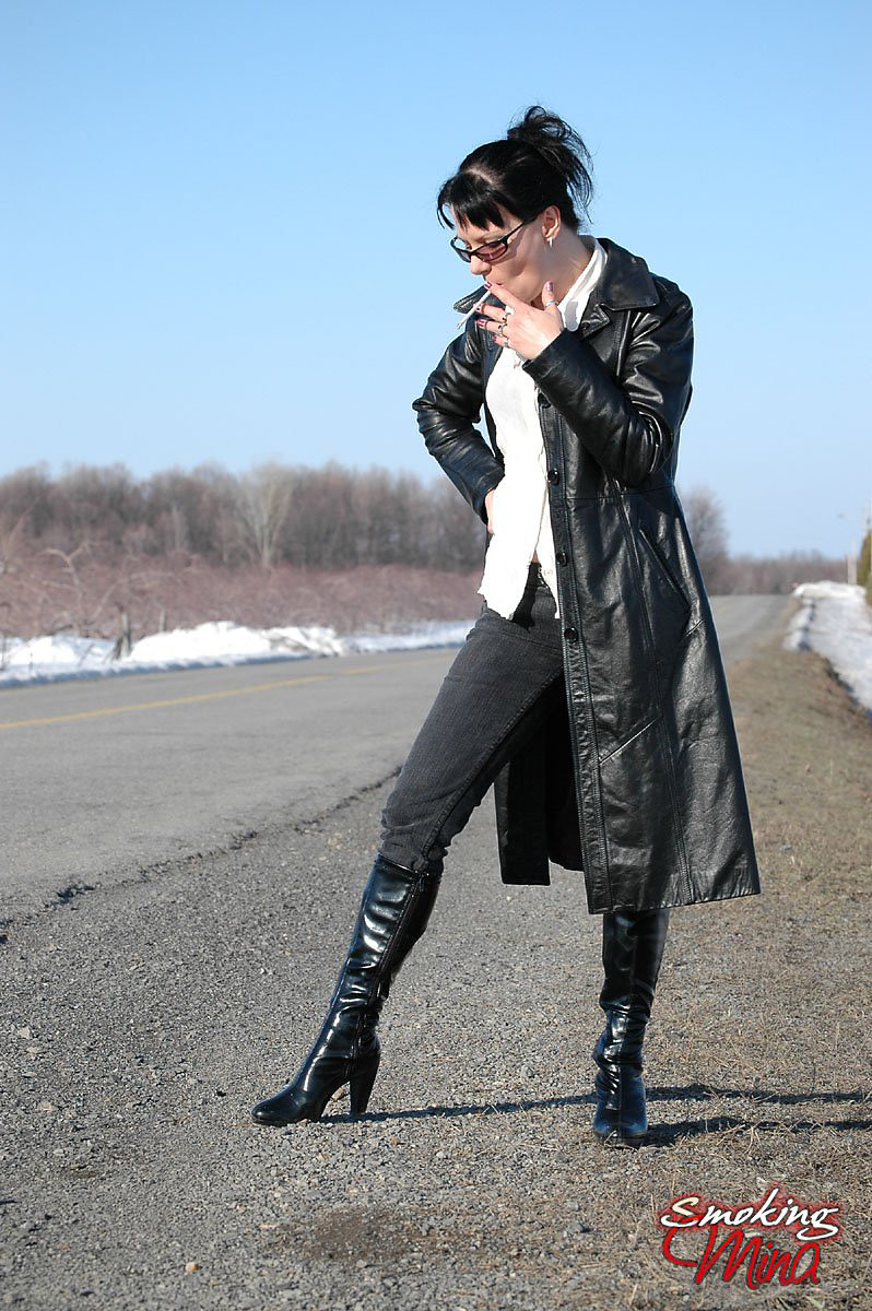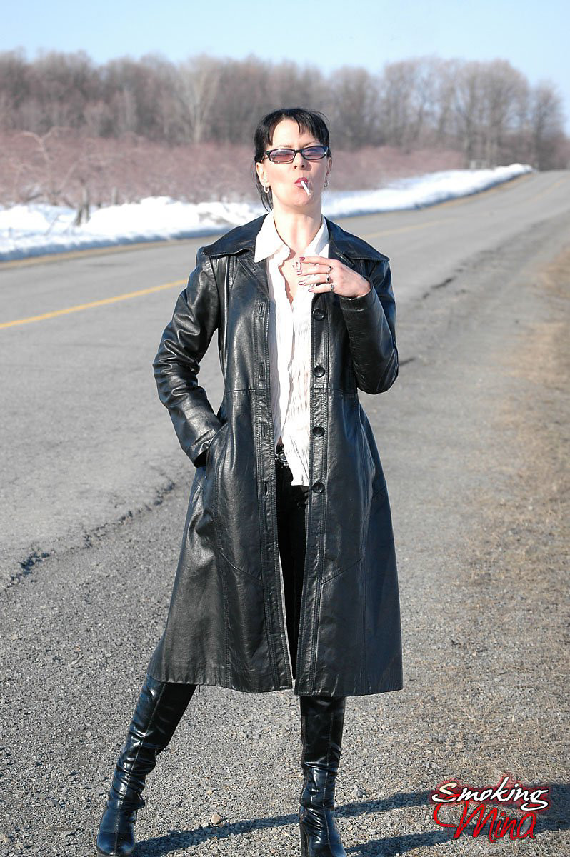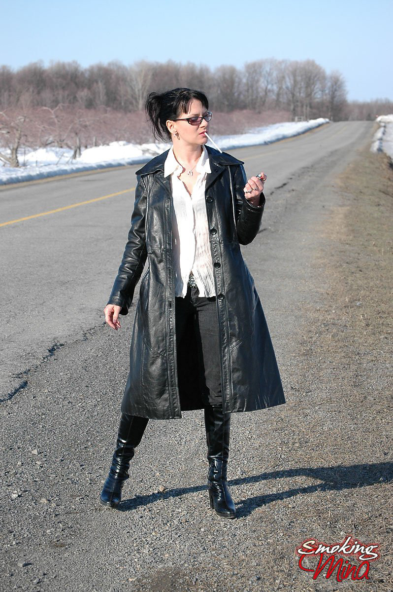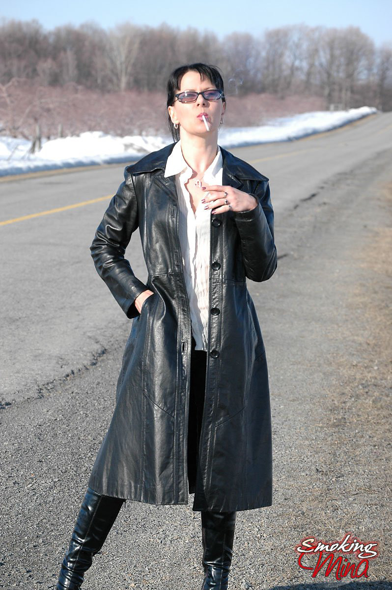 Badass babe in long leather coat smoking a ladylike Capri 120