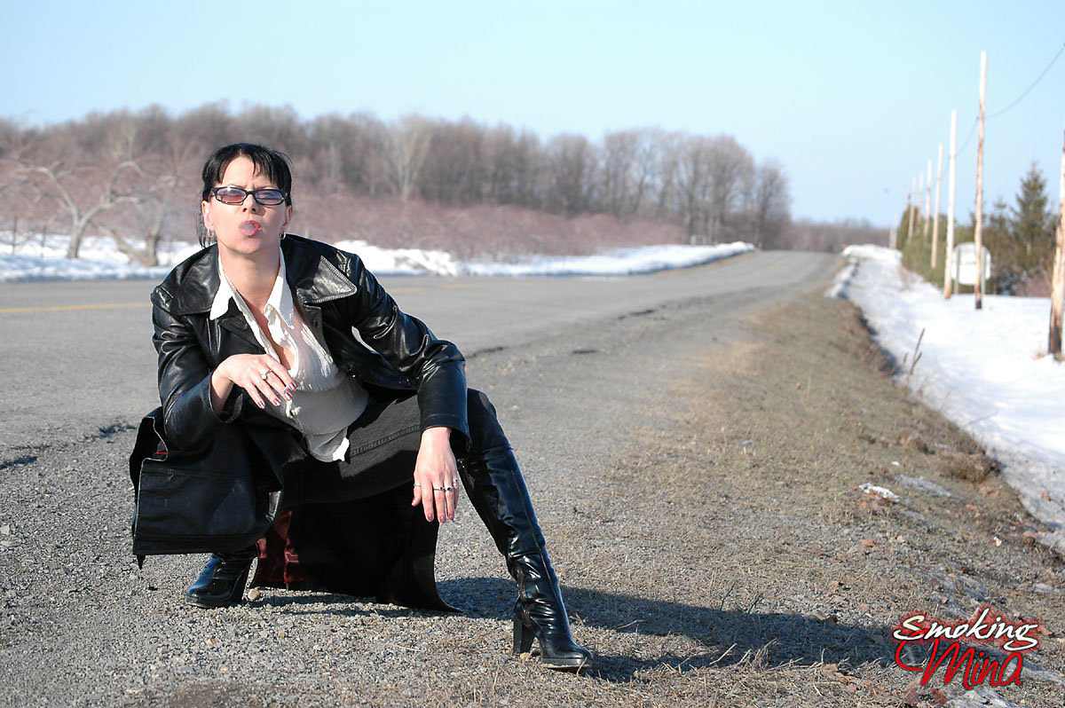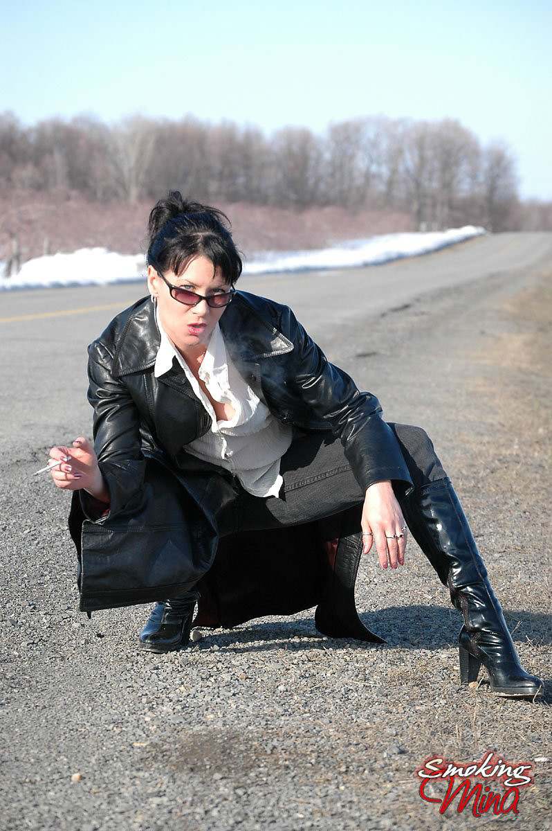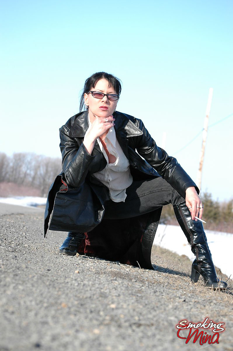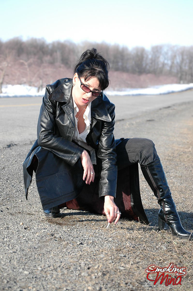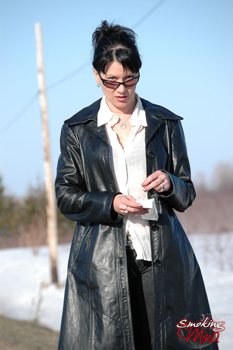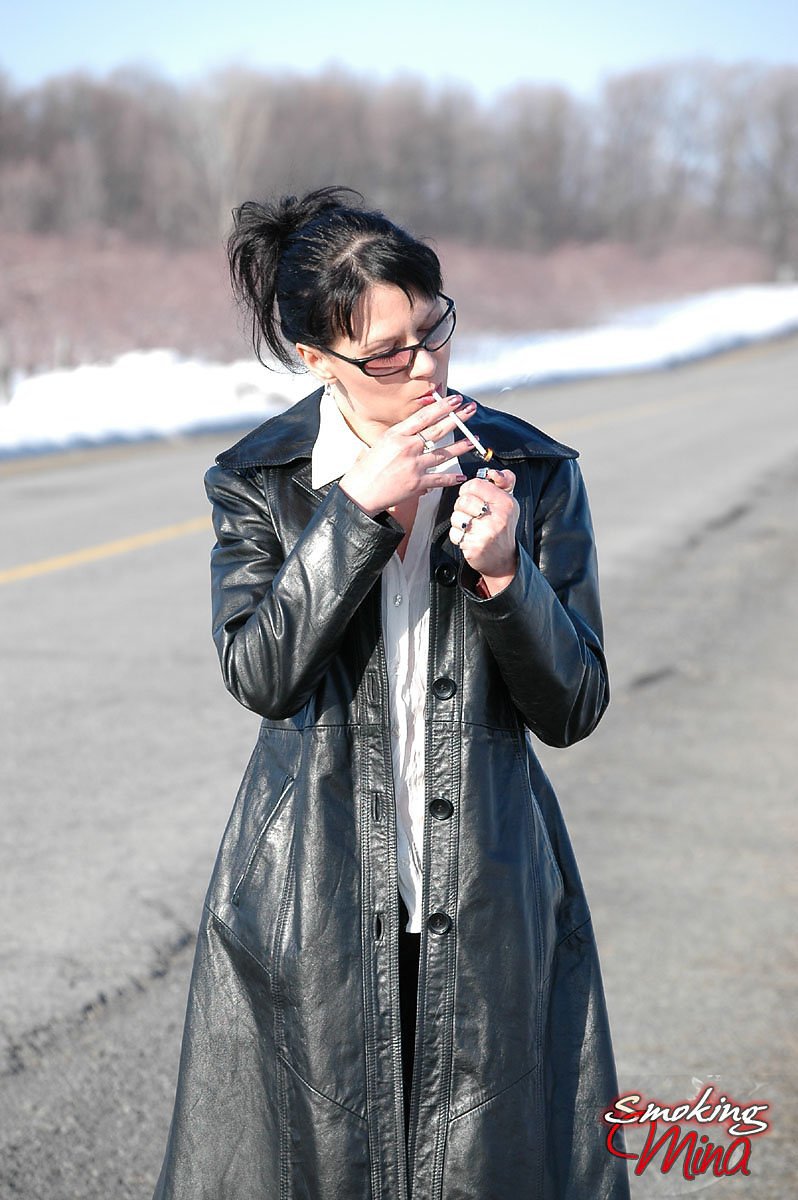 Badass babe in long leather coat smoking a ladylike Capri 120