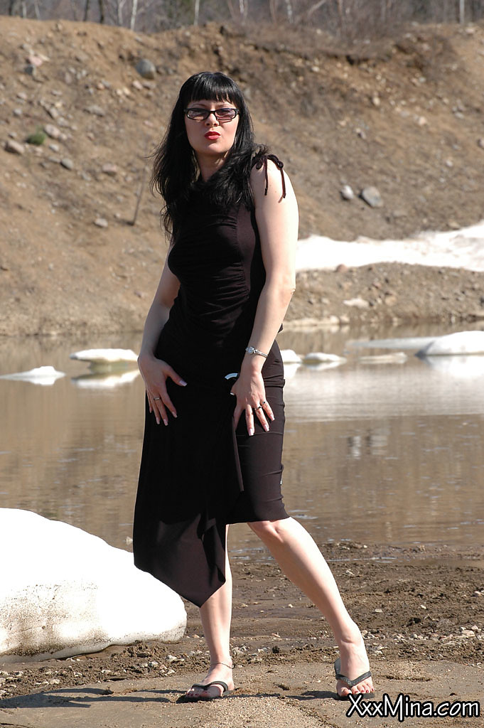 Gorgeous MILF in black pantyhose undresses slowly before the camera