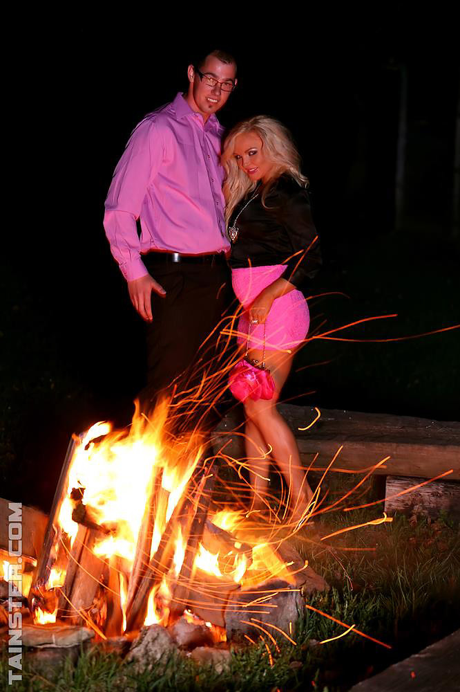 He lifts her so she can piss all over her wet open pussy