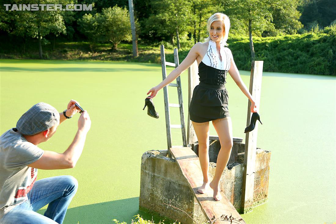 Hot blonde and guy outdoors having hot sex then pissing