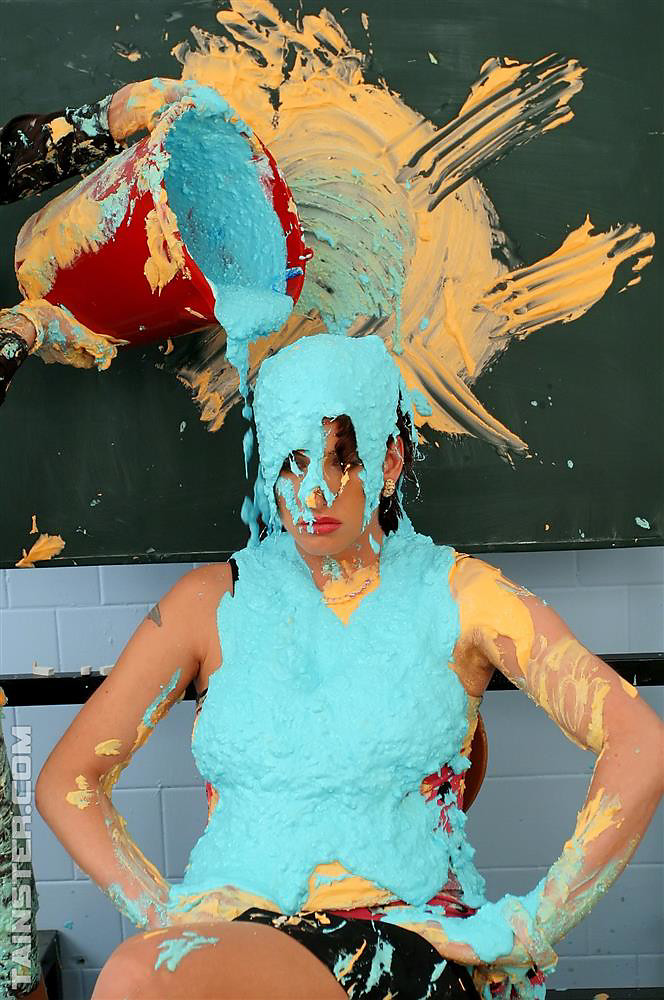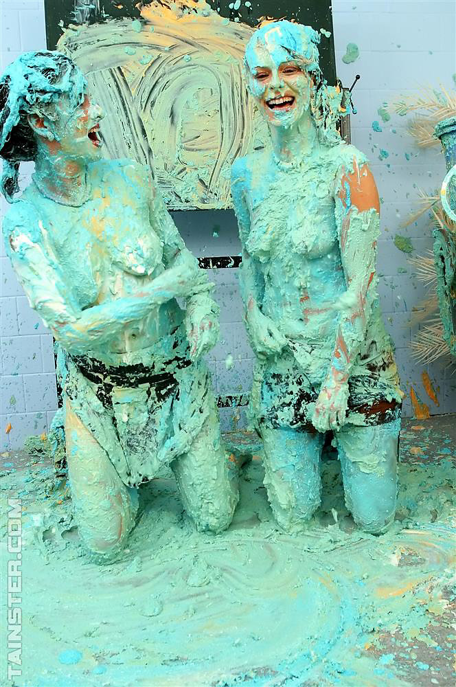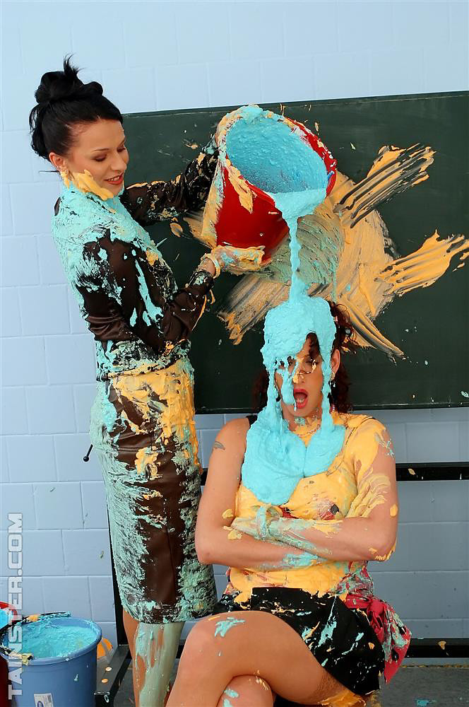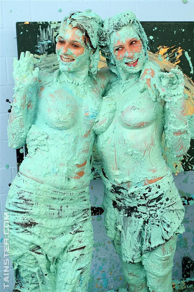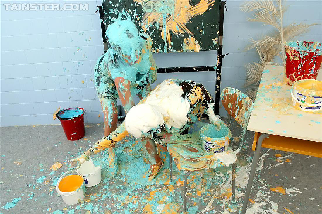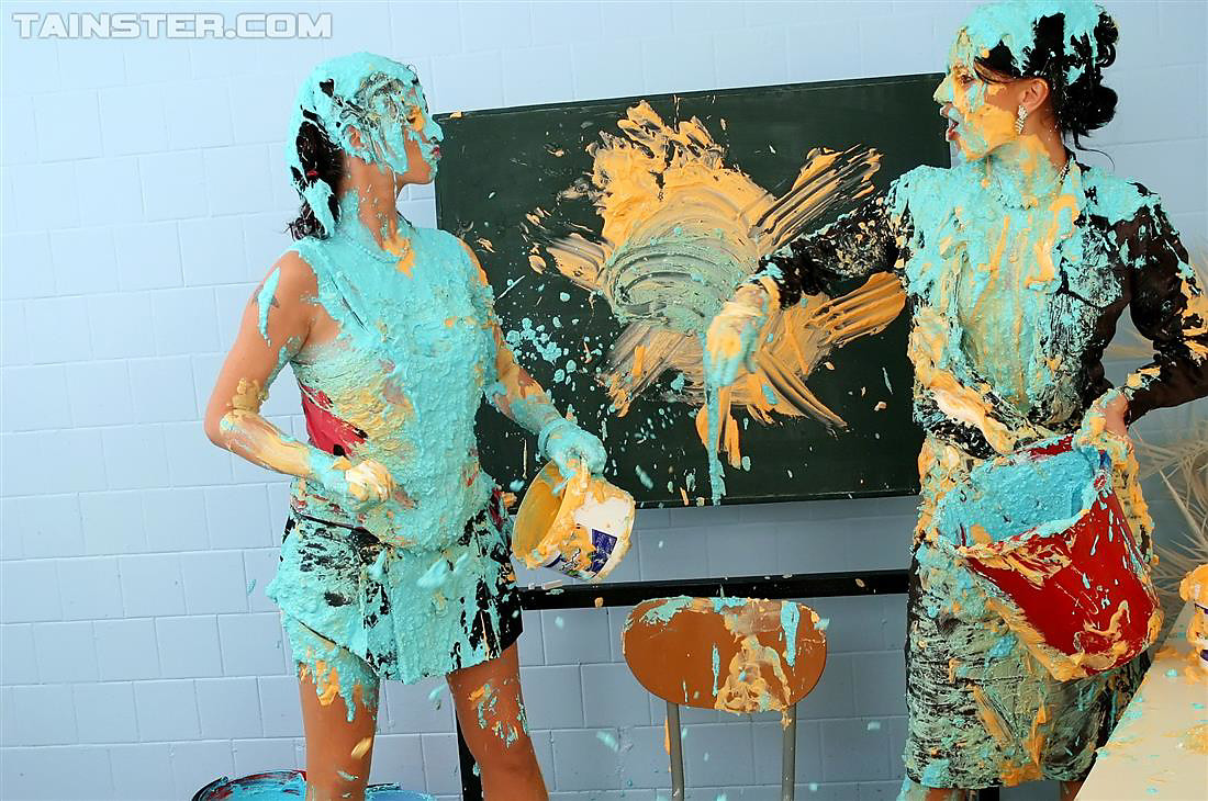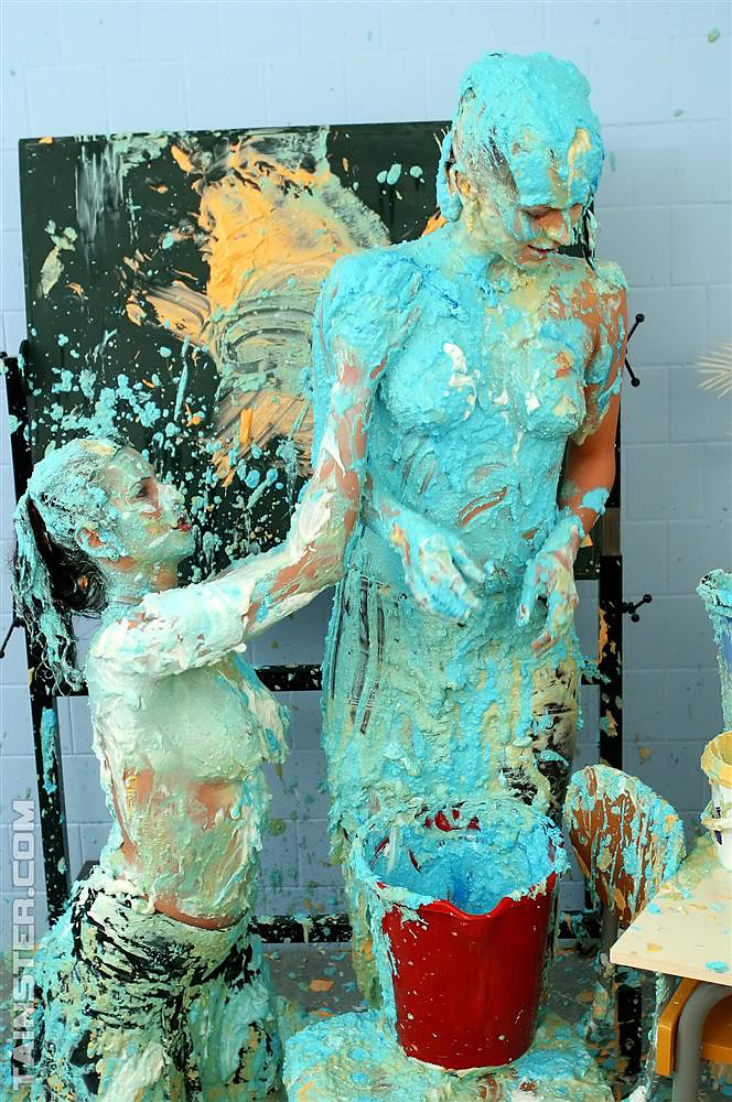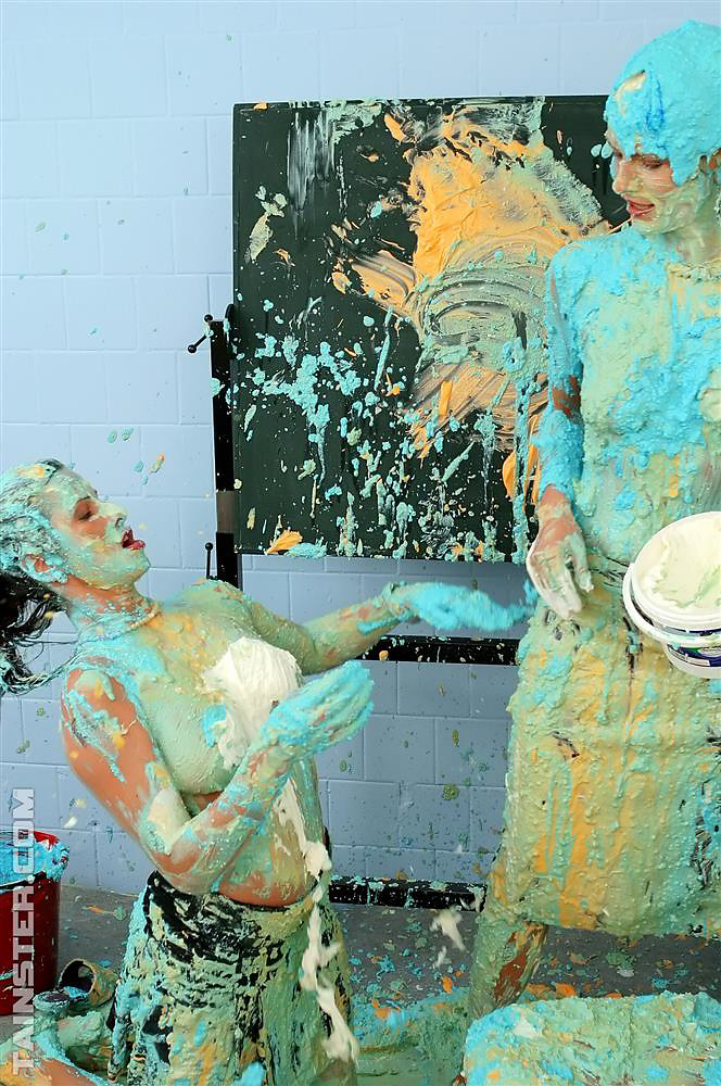 Two naughty slutty babes getting messy with lots of paint