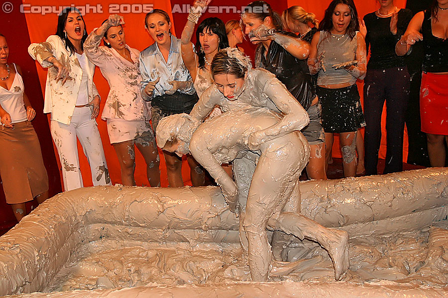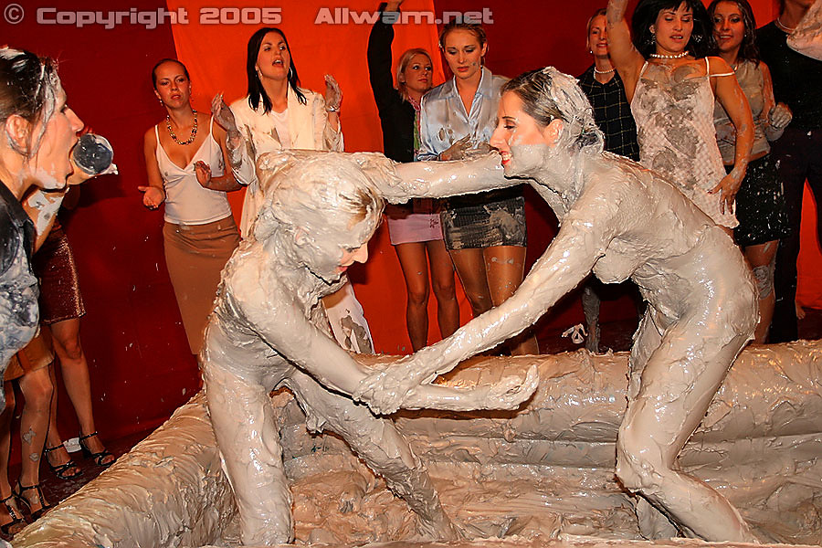 Erotic chicks wrestling each other and covered in thick mud
