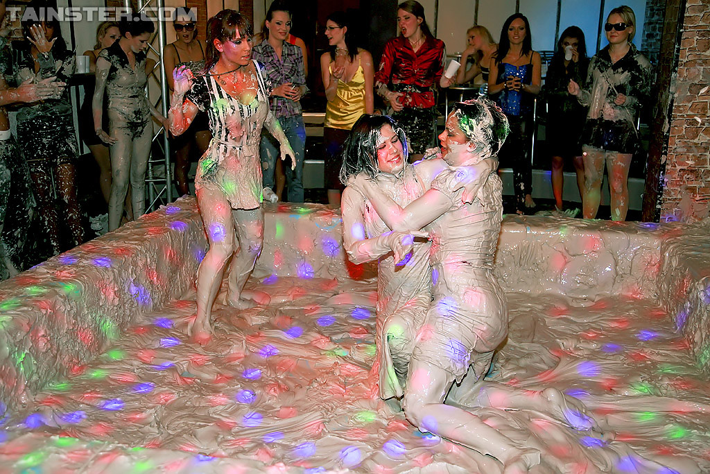 Smoking hot brunette babes wrestling around in a messy pit