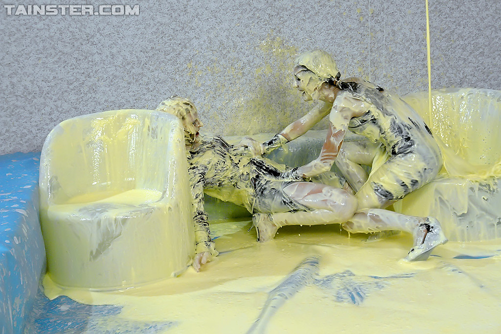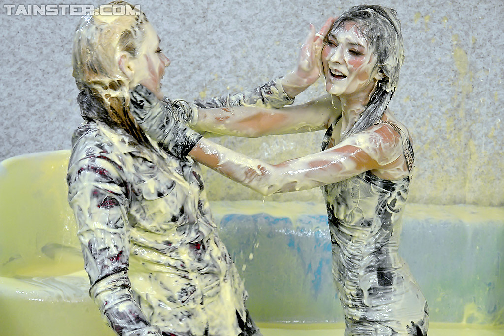 Two hot babes get covered in goo during messy trivia game