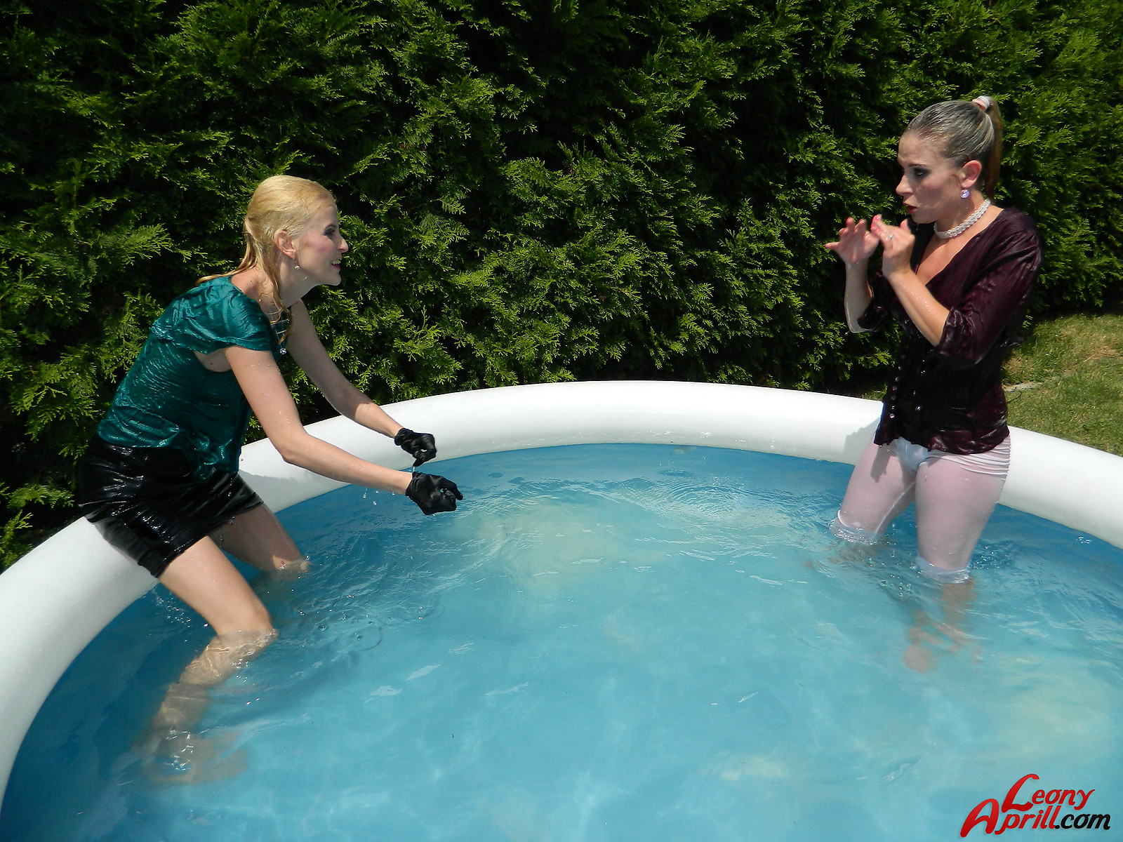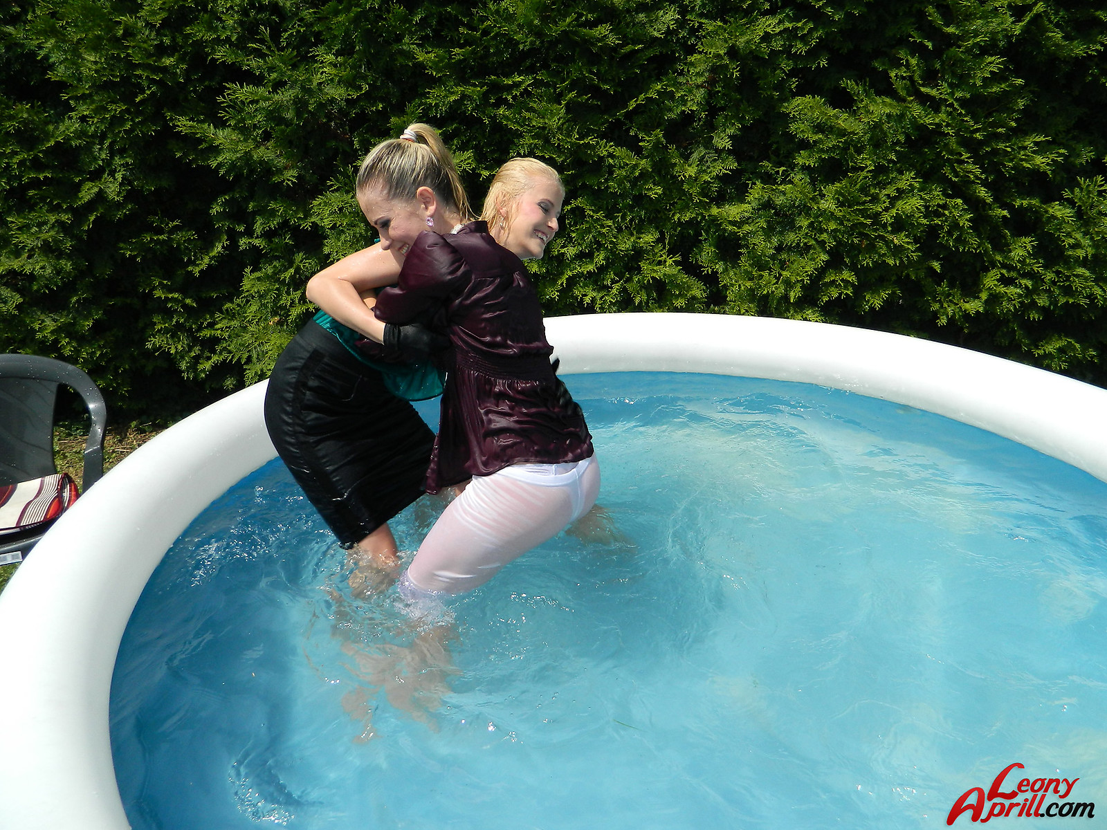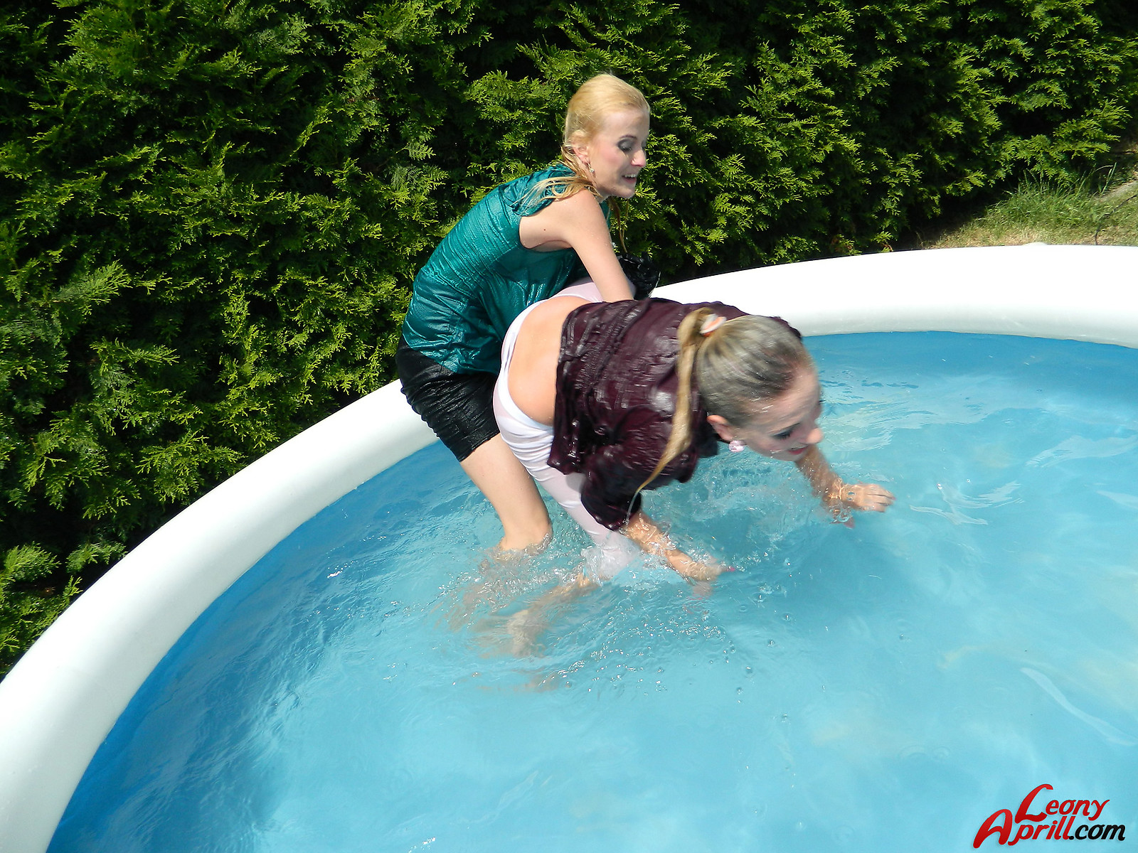 Pretty hot lesbian girls love diving into the garden pool