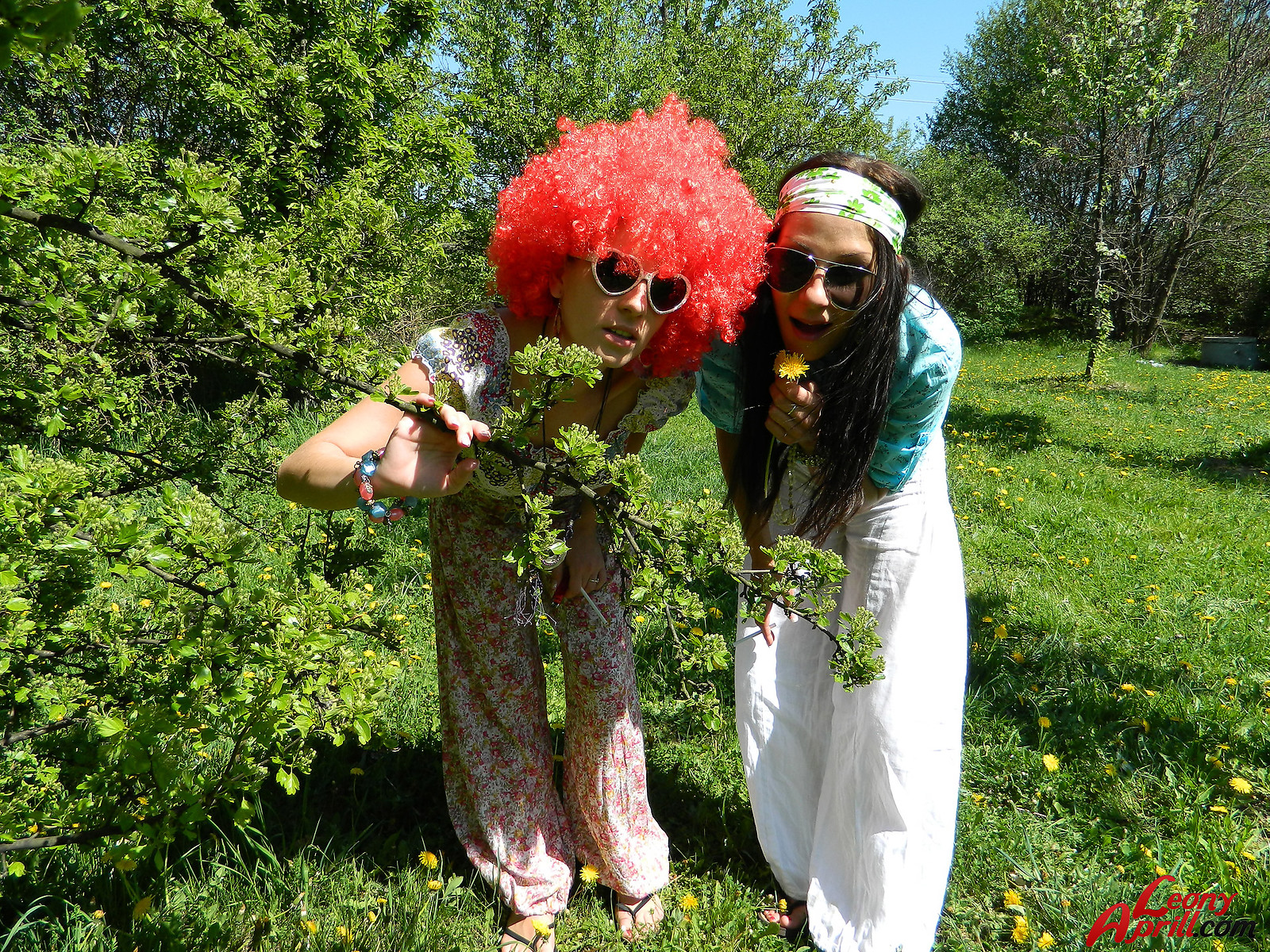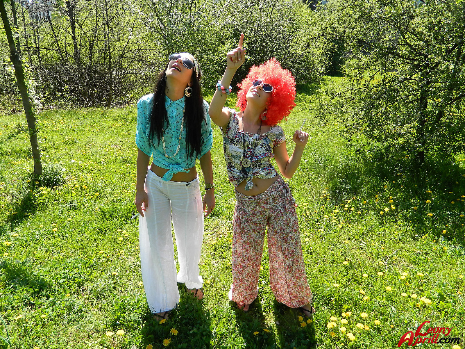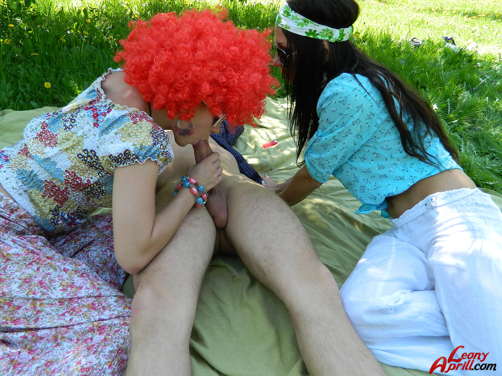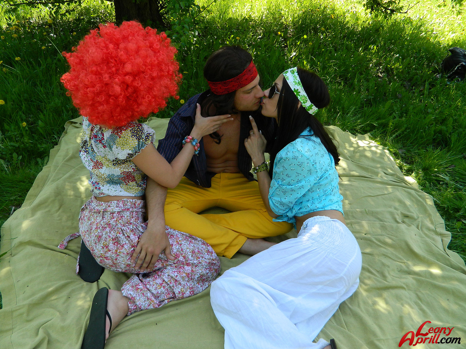 Two smoking hot nude hippies riding a stiff penis outdoors