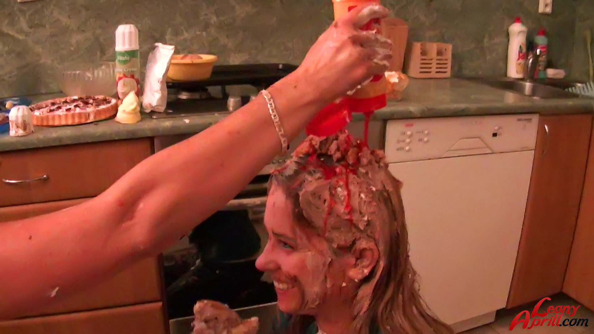 Sexy cooking teenage sweethearts playing with dirty pies