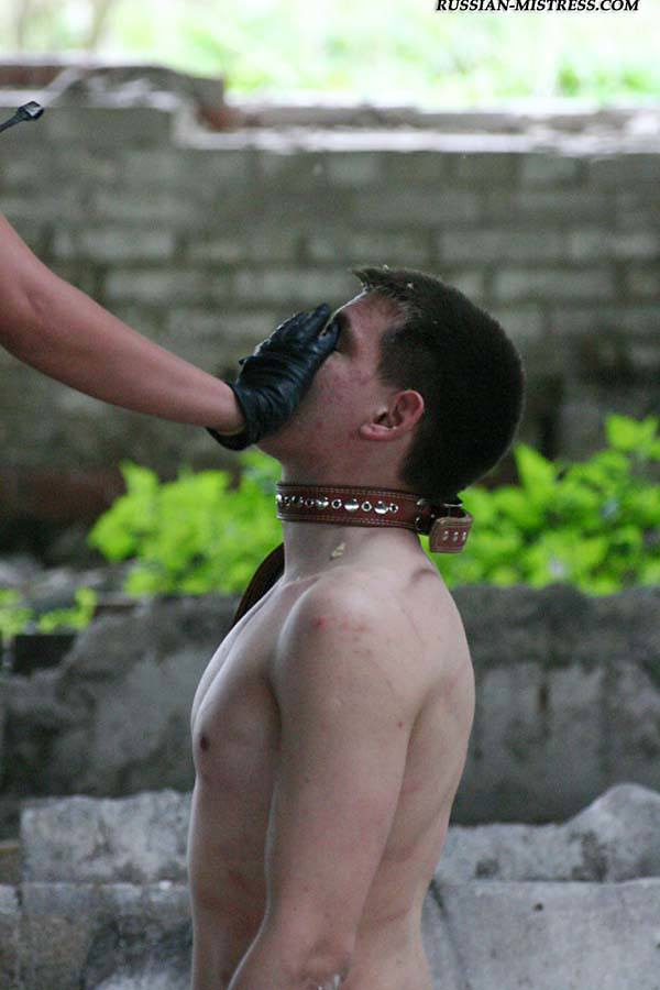 Latex mistress feeds her naked freak somewhere in ruines spitting chewed apple at him