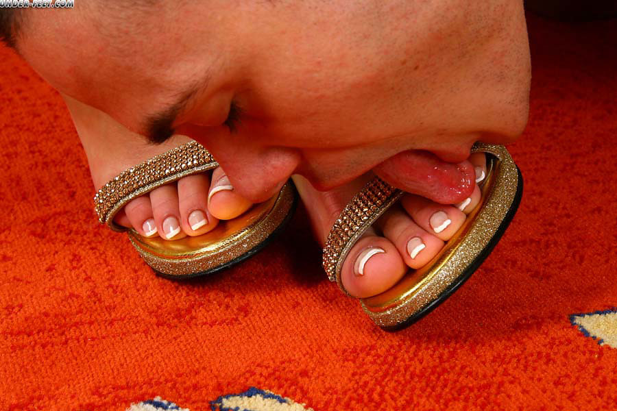 Humiliated slave licking mistress's heels before she lets him work her feet