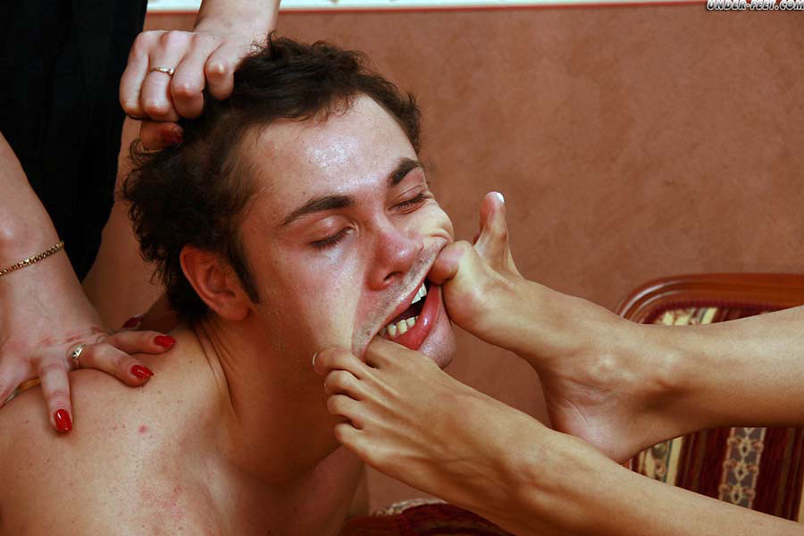 Attractive babes with perfect feet forcing naughty fella to licking them