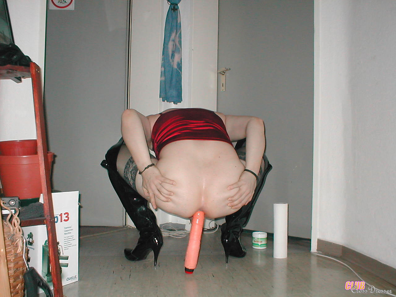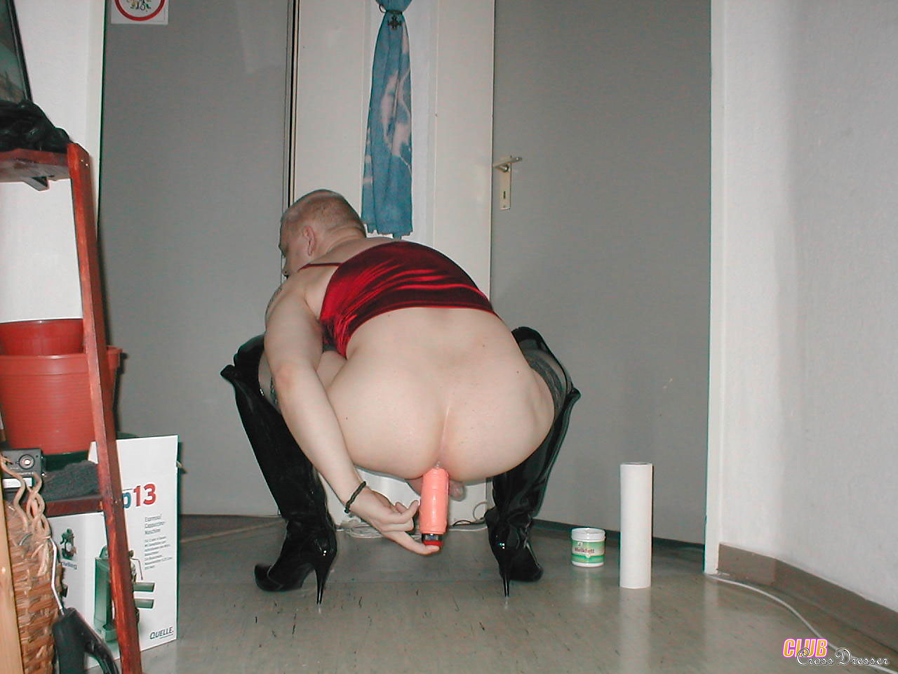 Short haired crossdressing slut pissing and fucking her ass with a big dildo