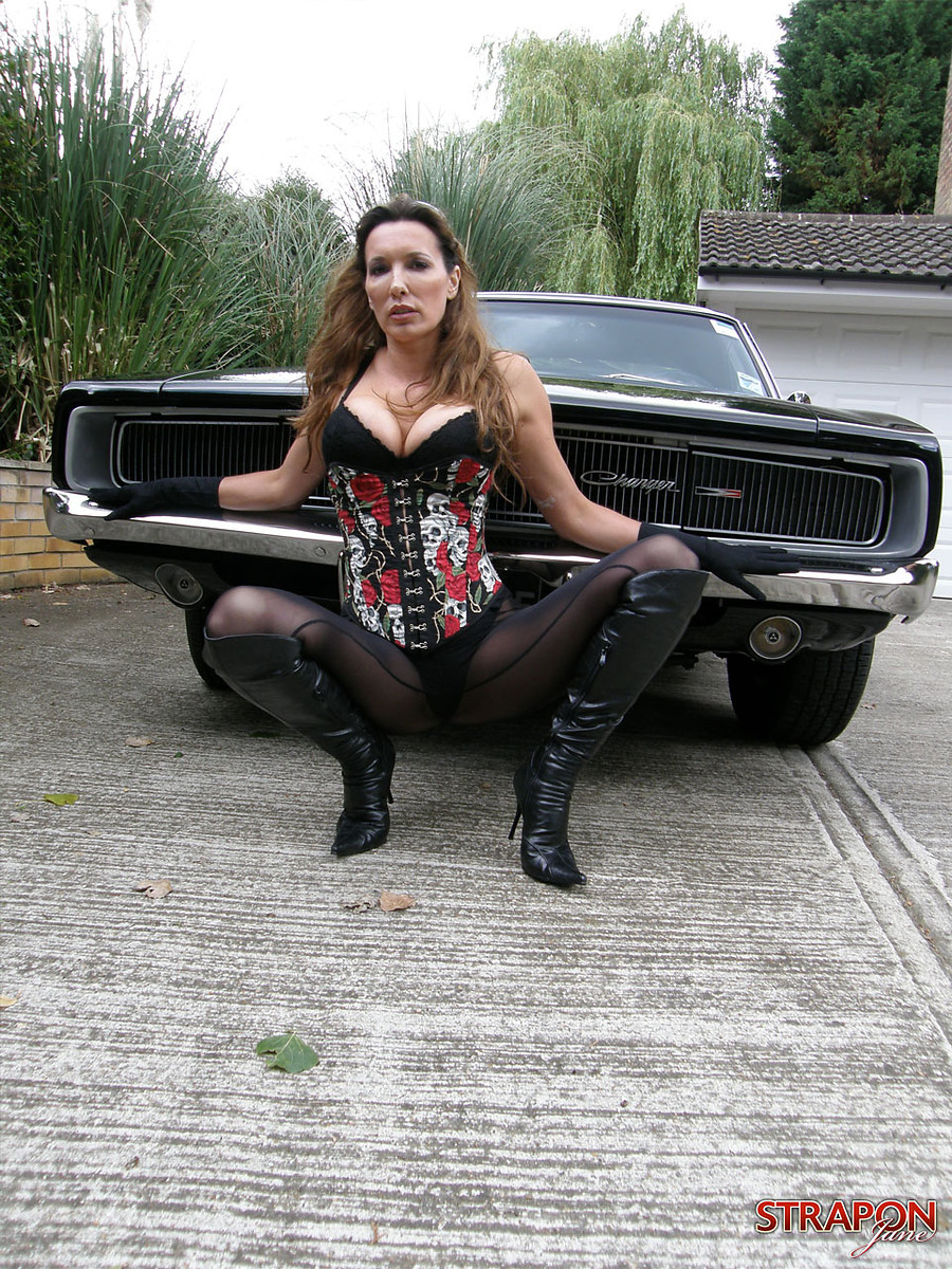 Strapon Jane posing outdoors infront of sexy mustang car