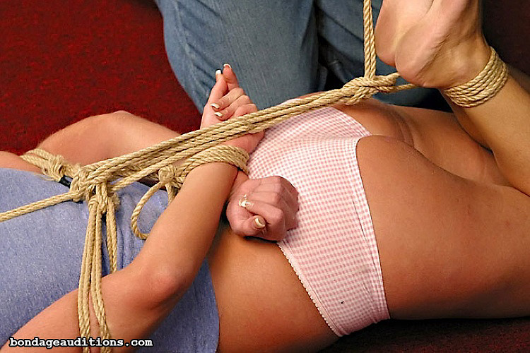 Sexy redhead wearing a gas mask tied to a fence outdoors