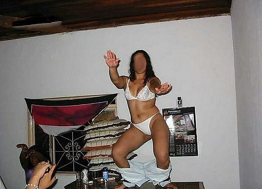Adrianna in suntan sheer to the waist and a little striped skirt