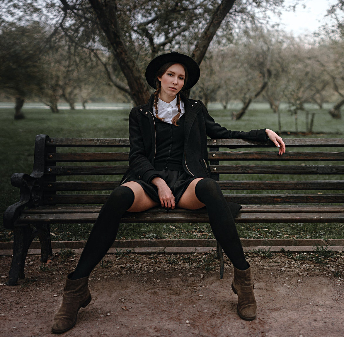 Curly gal staring at her delicious feet clad in black reinforced toe tights