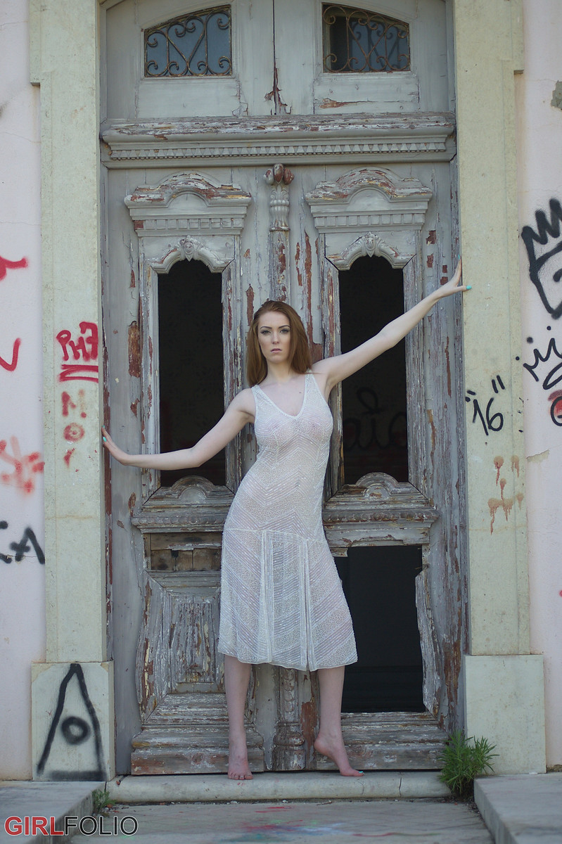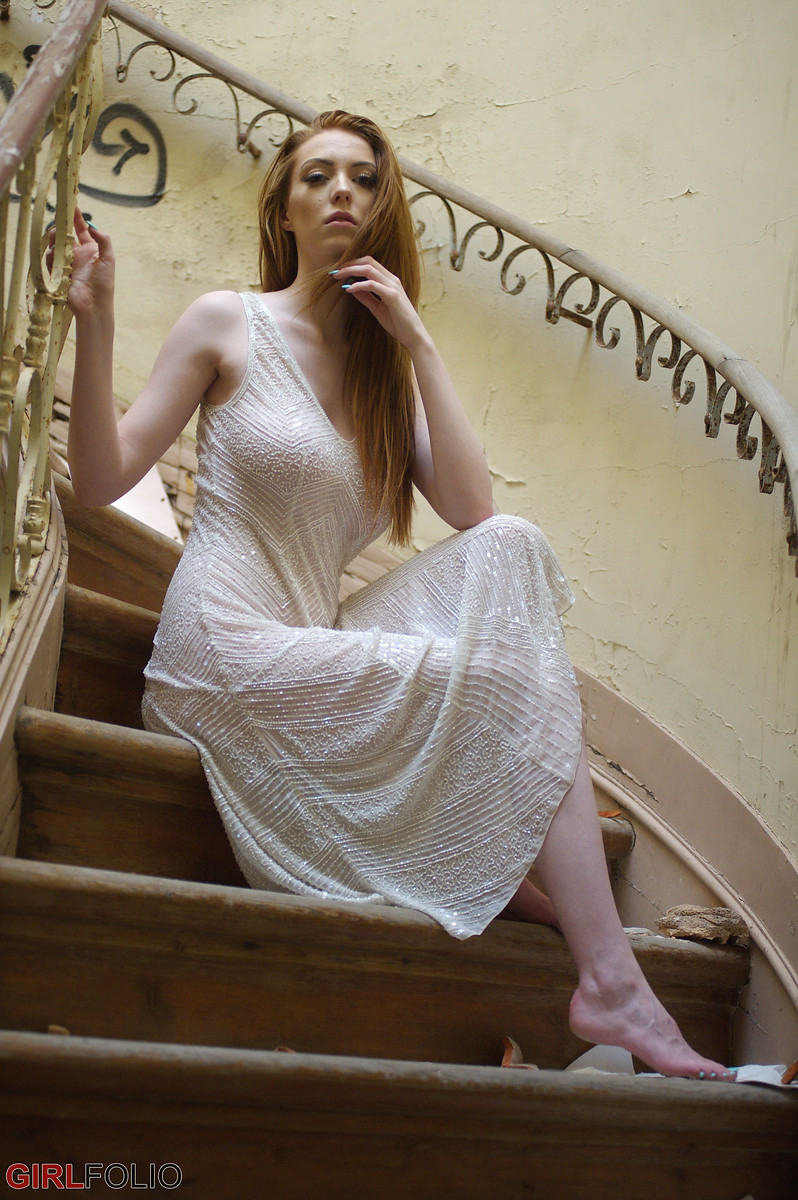 Shades of the Dickens novel Great Expectations as Alice - in her debut set for GIRLFOLIO poses in a vintage dress inside a derelict mansion house