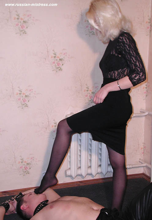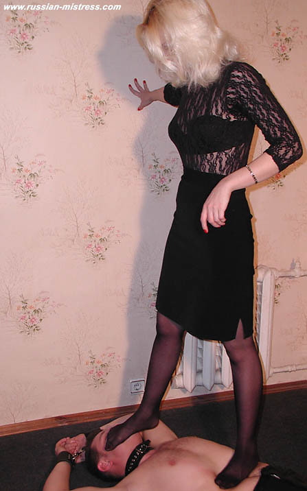 Blonde russian misstress in black stocking and leather boots trample slave's face and get her dirty smelly feet licking