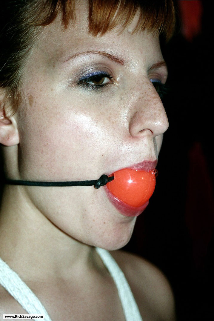 Sexy redhead wearing a gas mask tied to a fence outdoors