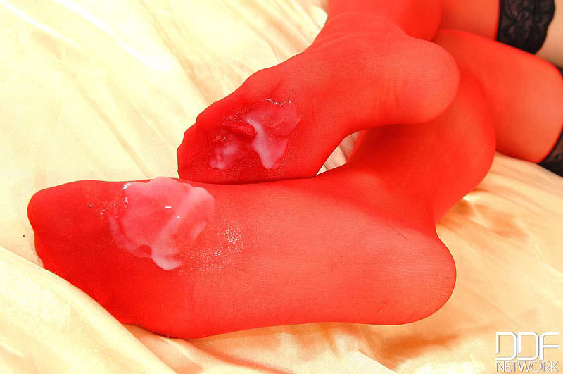 Stracy gives a footjob in stockings