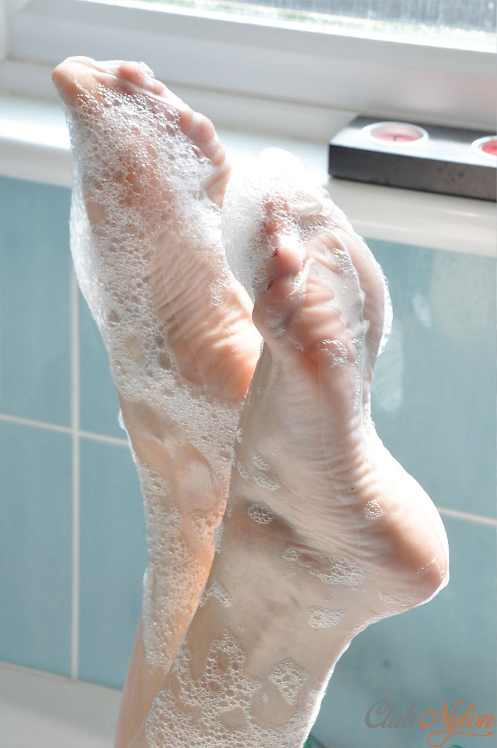 Jane gets her nylon stockings soaking wet as she takes a seductive bath.