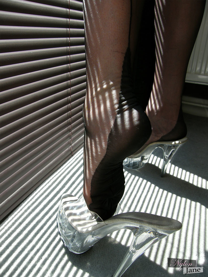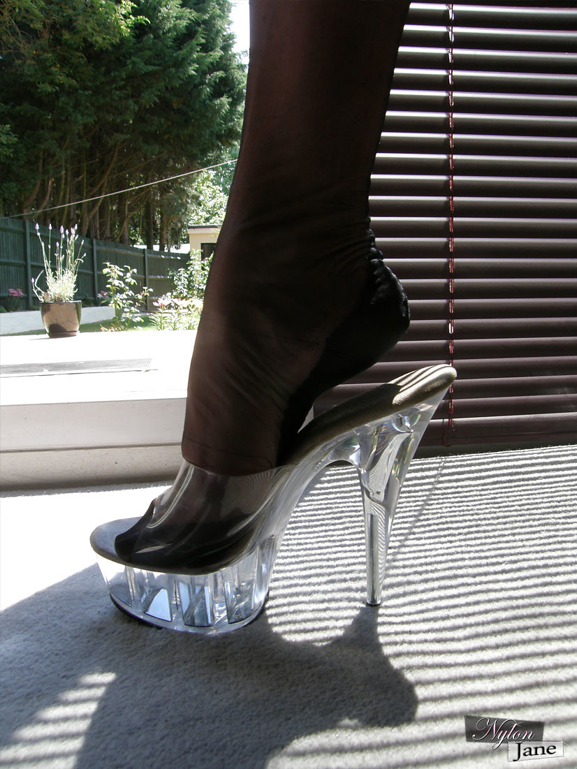 Nylon Jane showing off her clear high heels and sexy ass