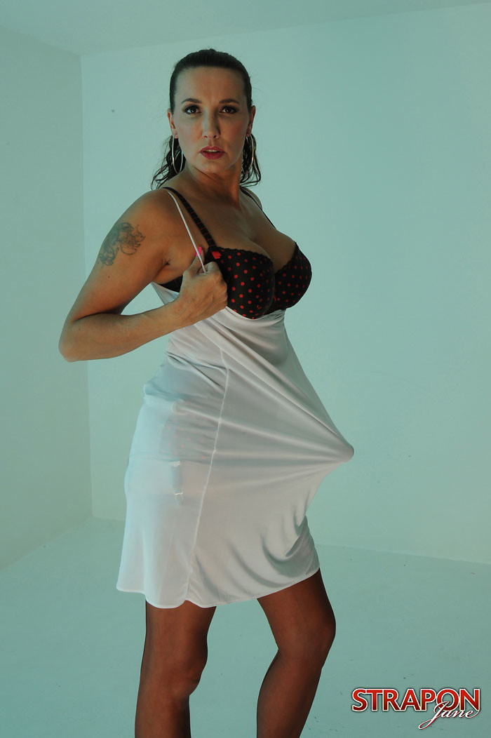 Various pictures of Strapon Jane posing with her signature strapon cock