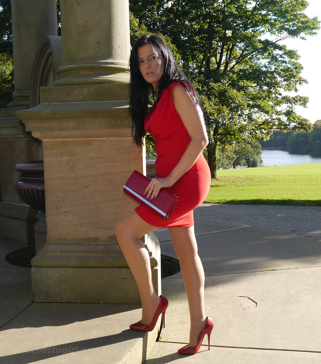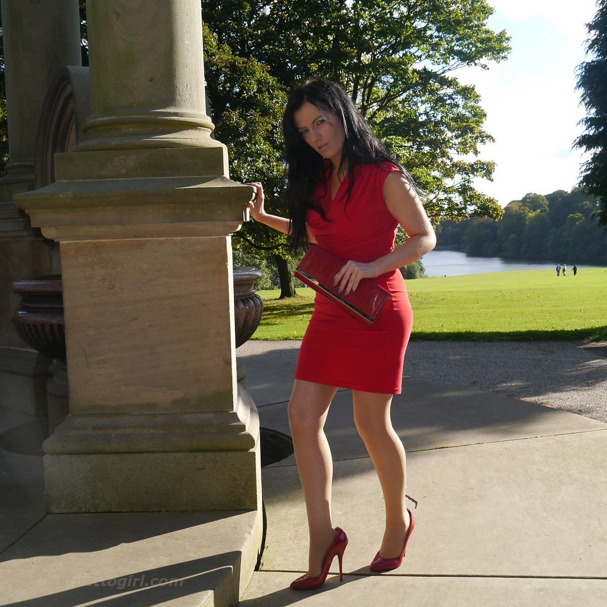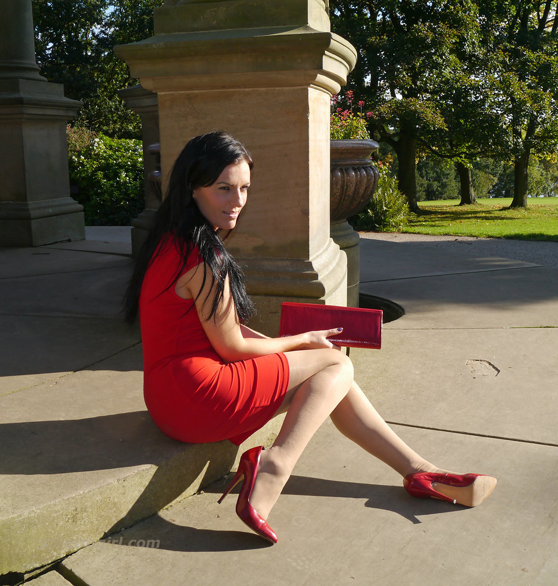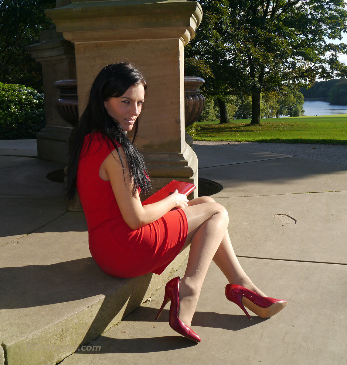 Sexy Tricia takes a stroll outdoors wearing a tight red dress with matching high heel shoes and handbag