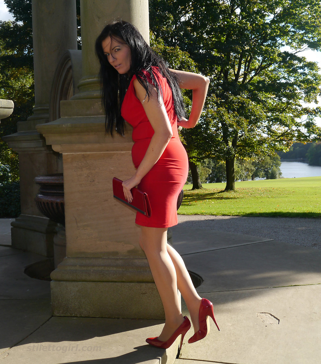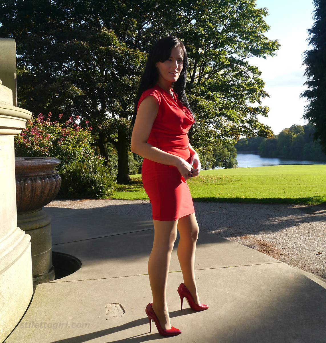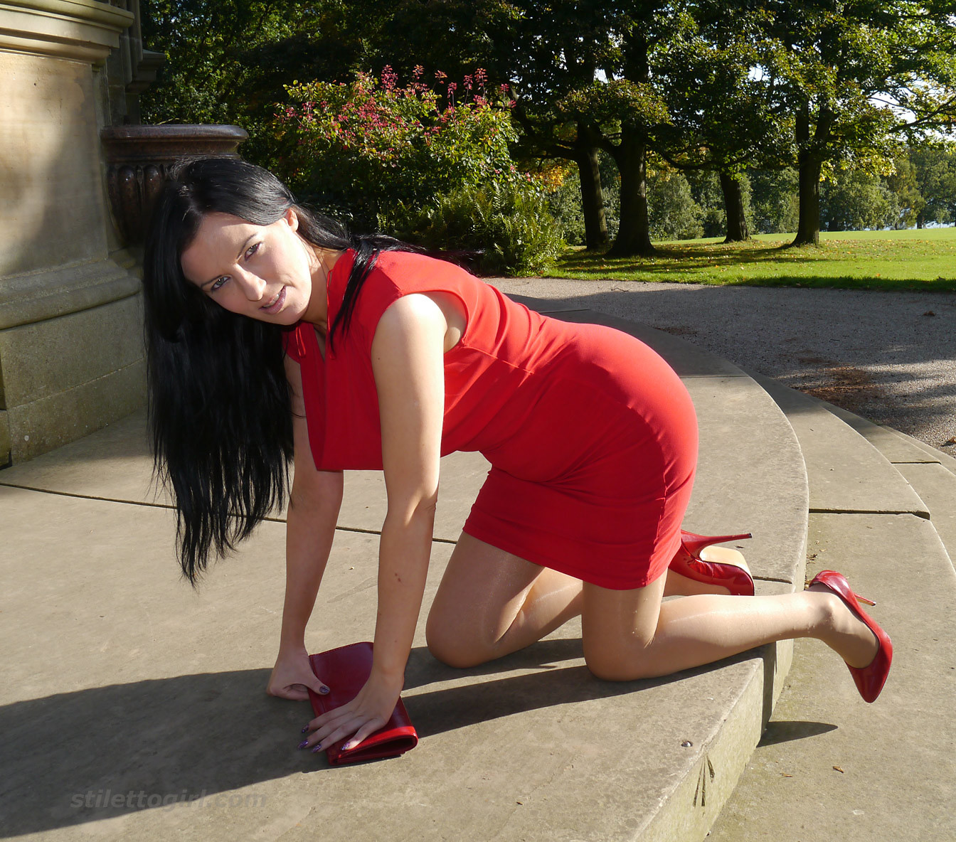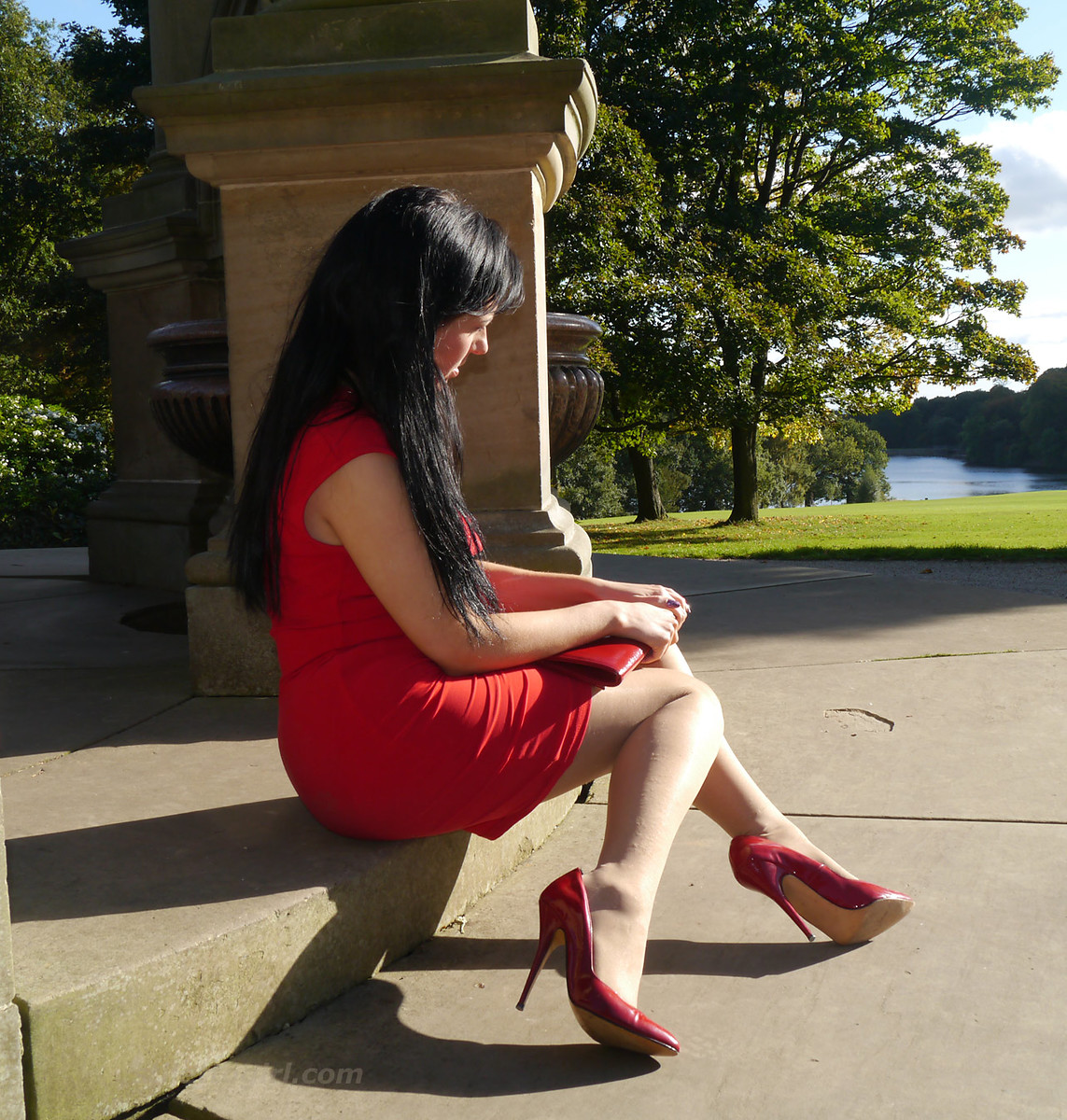 Sexy Tricia takes a stroll outdoors wearing a tight red dress with matching high heel shoes and handbag