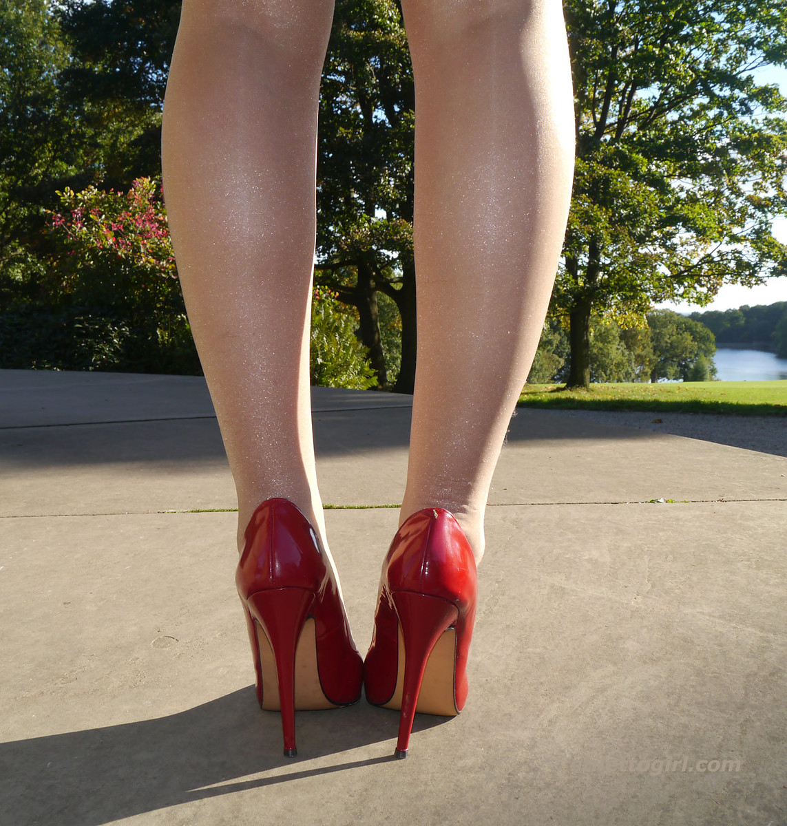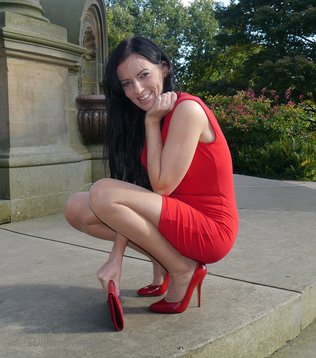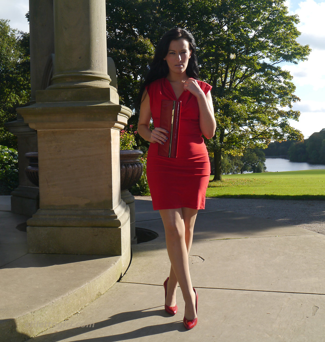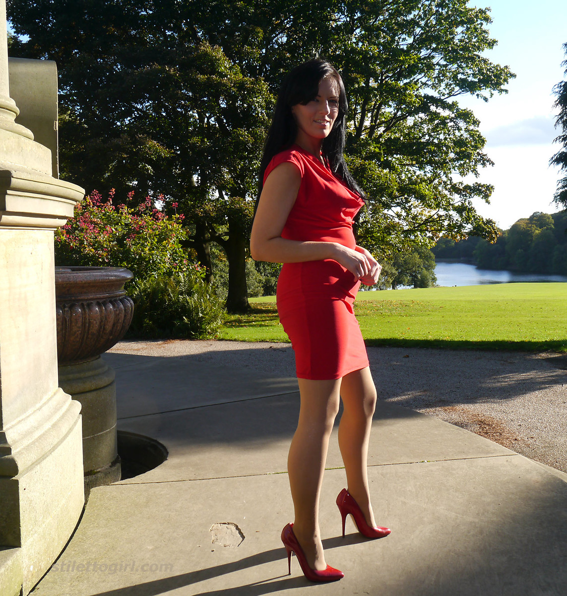 Sexy Tricia takes a stroll outdoors wearing a tight red dress with matching high heel shoes and handbag