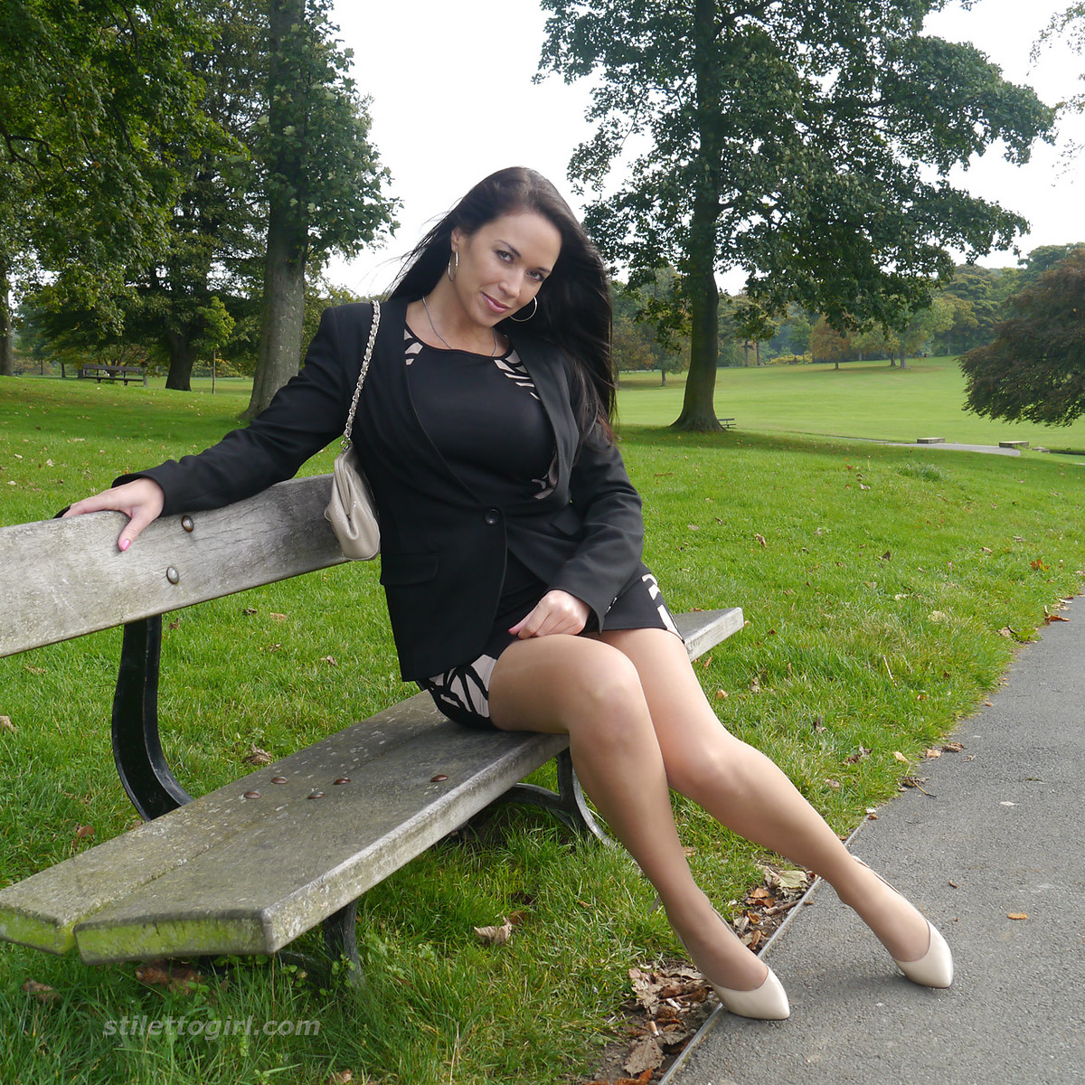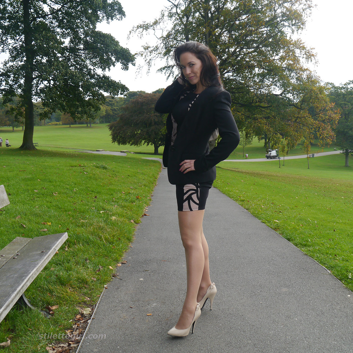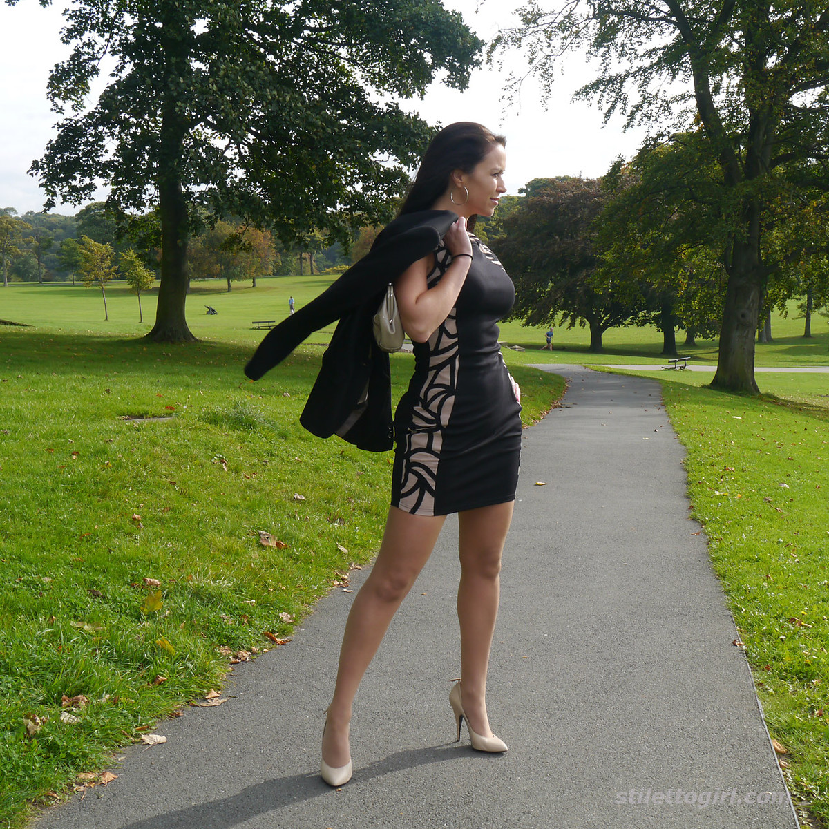 A tight black dress and creamy high stiletto heels gets this dark haired beauty in the mood for some outdoor fun