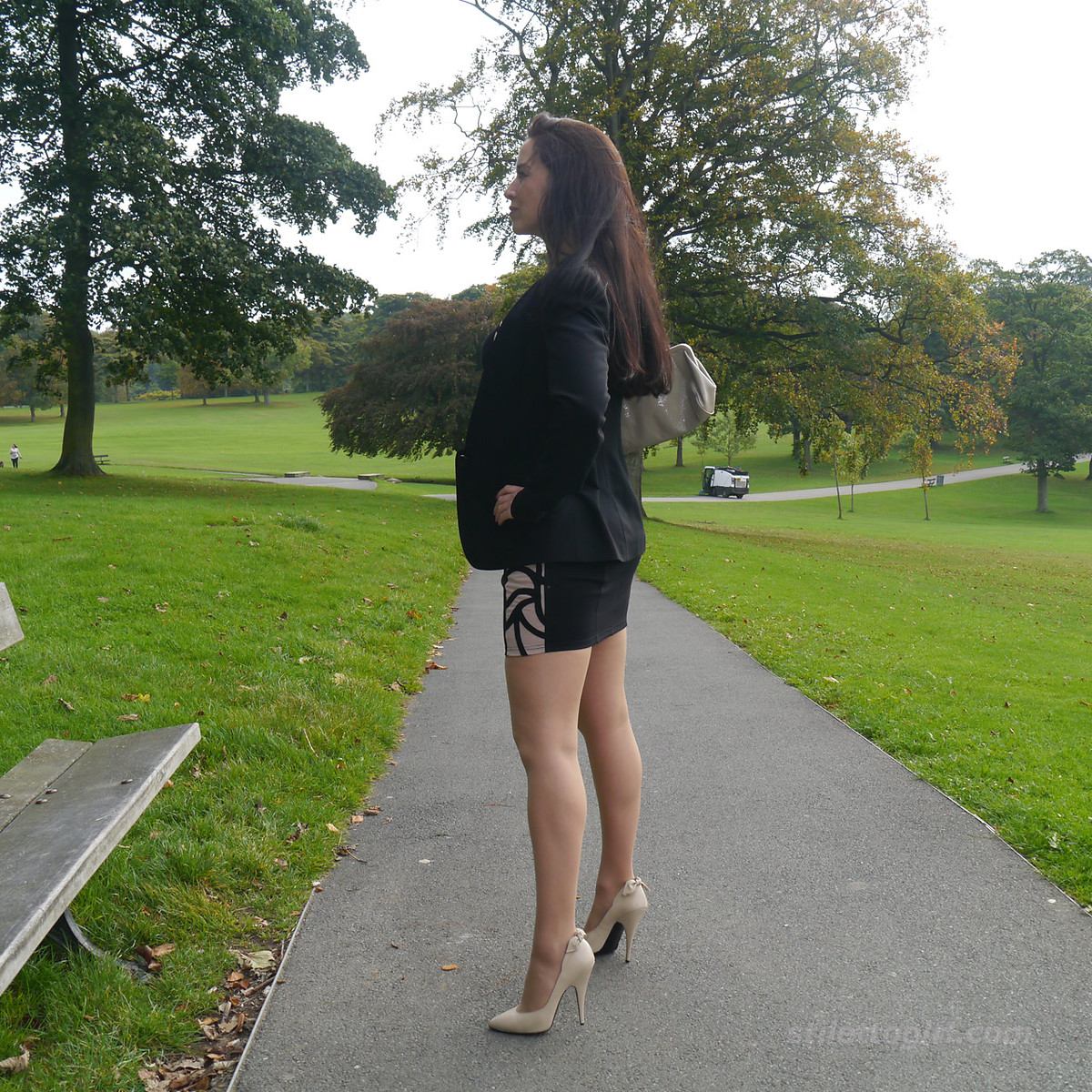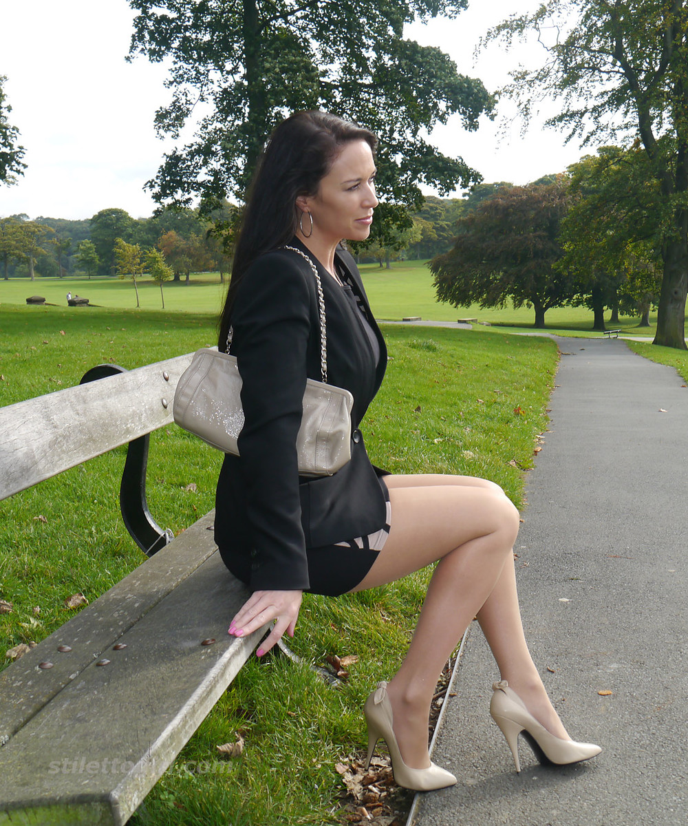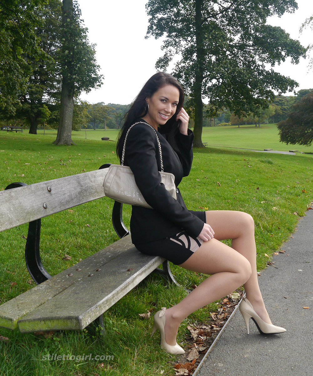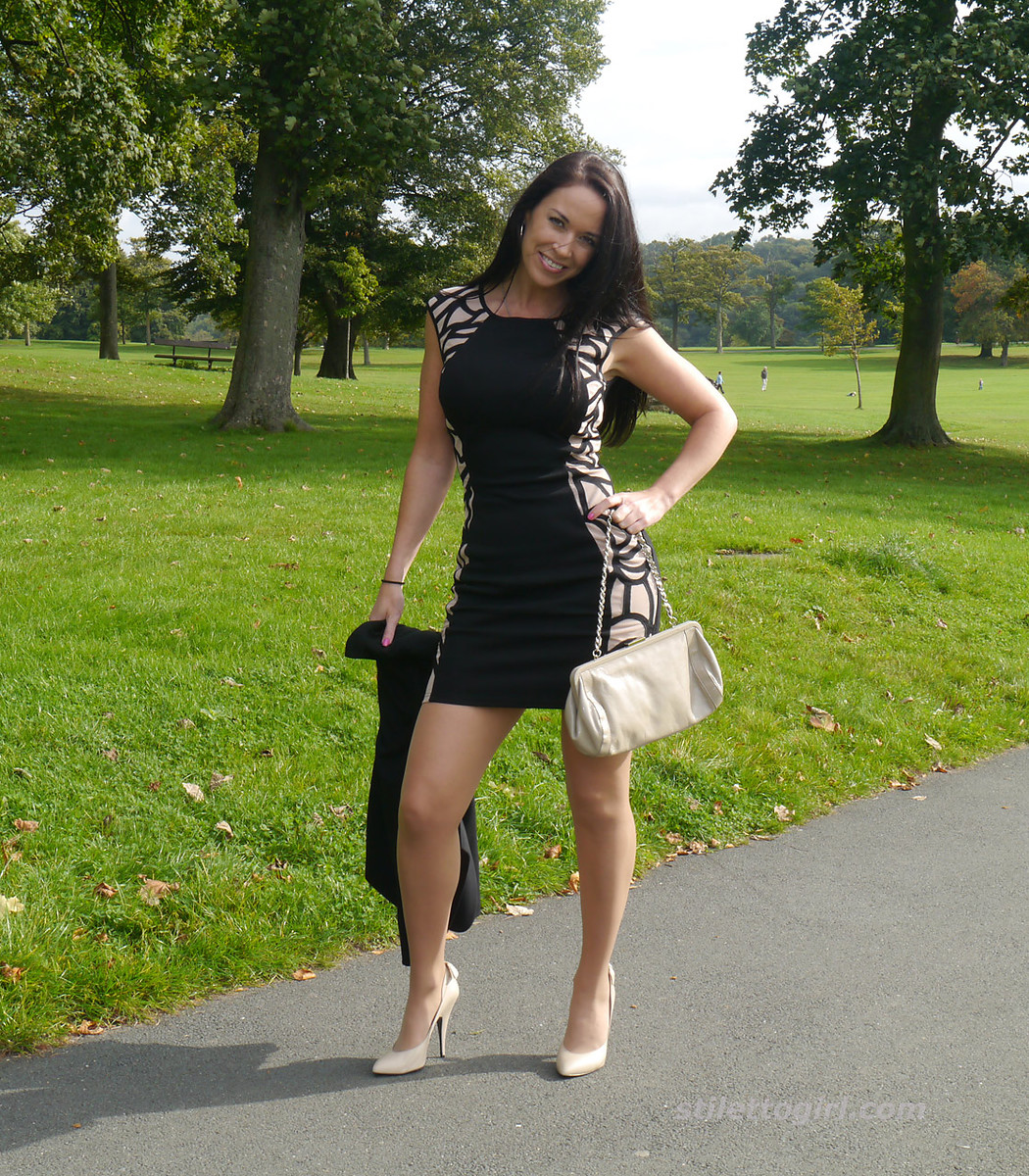 A tight black dress and creamy high stiletto heels gets this dark haired beauty in the mood for some outdoor fun