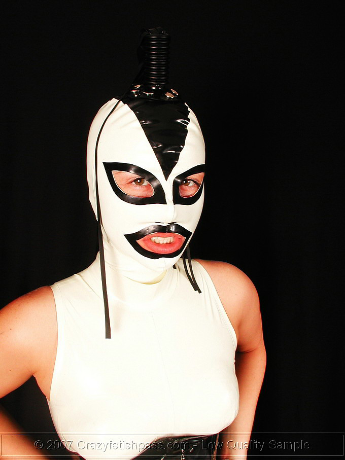 Chantal in rubber mask playing with a dummy
