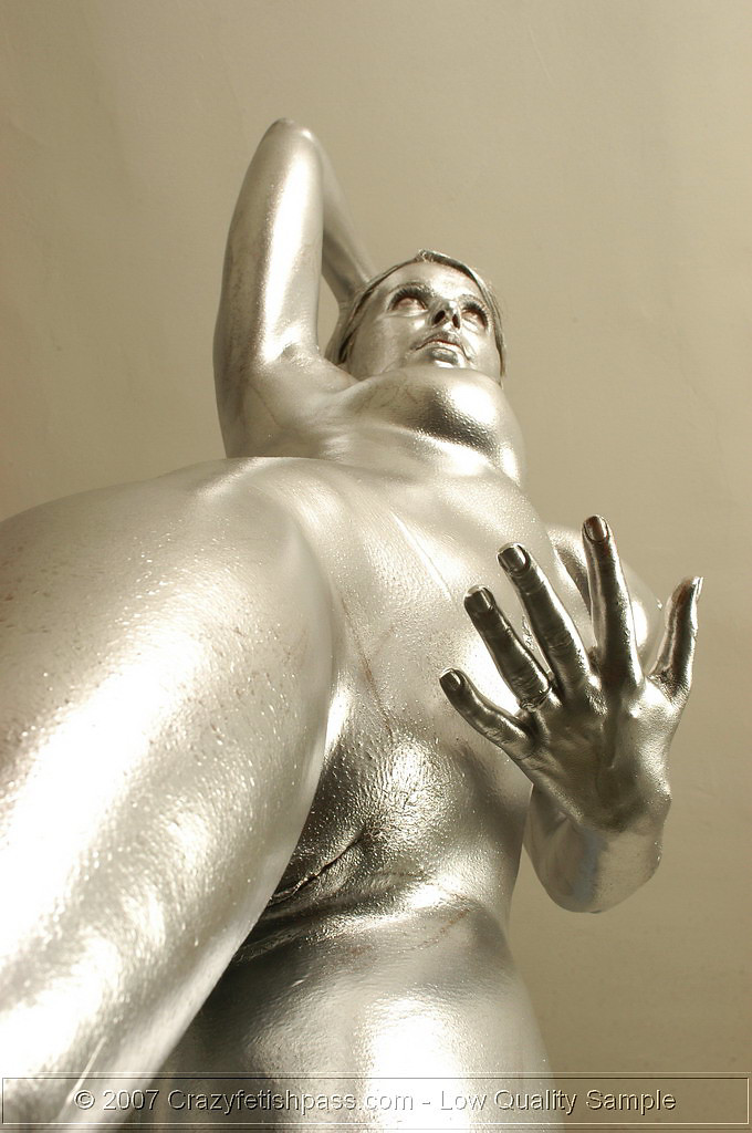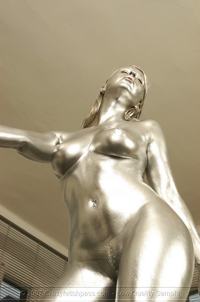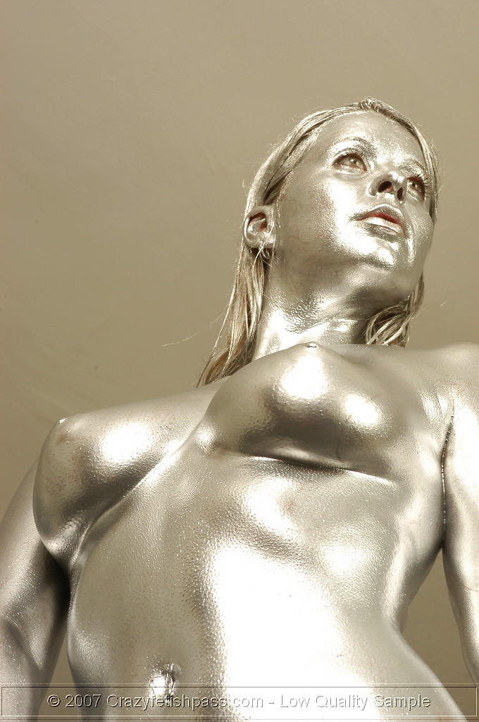 A beautiful blonde is hiding under this tight and shiny black catsuit.