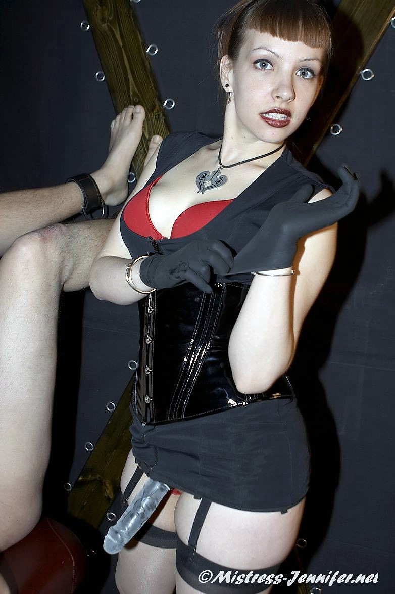 Dominatrix in latex suit uses monster dildo on her boy toy gaping his chute