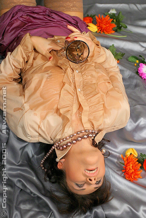 Beautiful woman pouring water on herself and see thru shirt