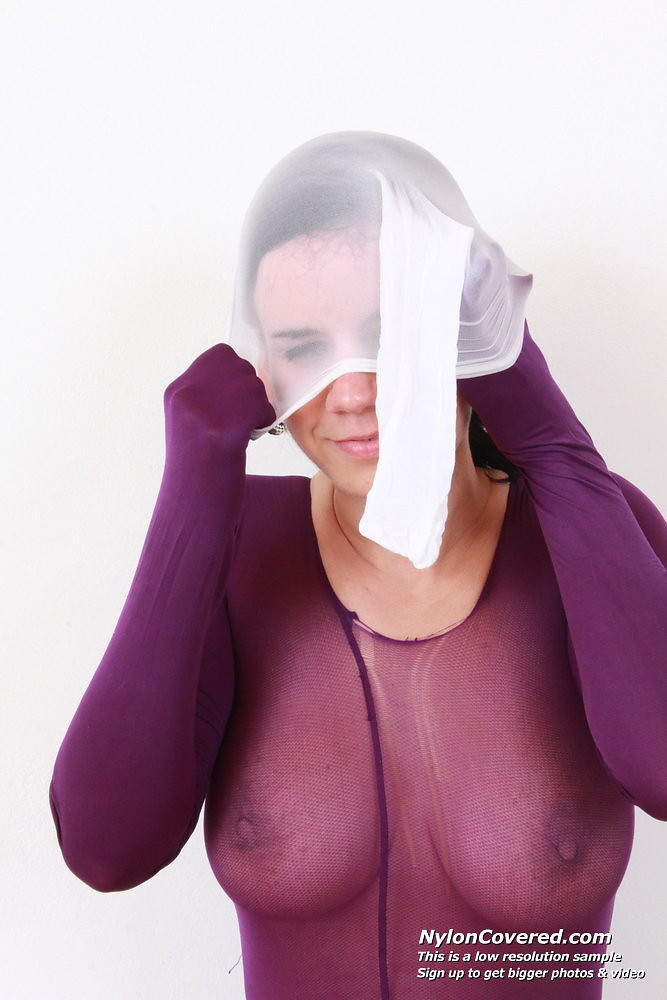 Brunette rides a black vibrator while being covered in pantyhose