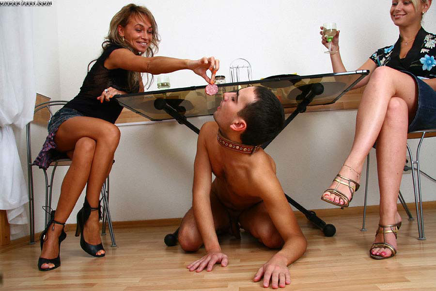 Girlfriends drink champagne and feed the slave crawling under table licking their feet